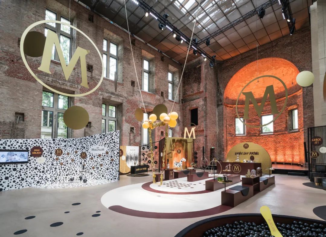 活動現(xiàn)場的配色方案和設(shè)計靈感來源于夢龍的產(chǎn)品,巨大的圓點和圓潤的設(shè)計語言引用了周年紀(jì)念版“白巧克力和餅干”以及著名的夢龍剪影。