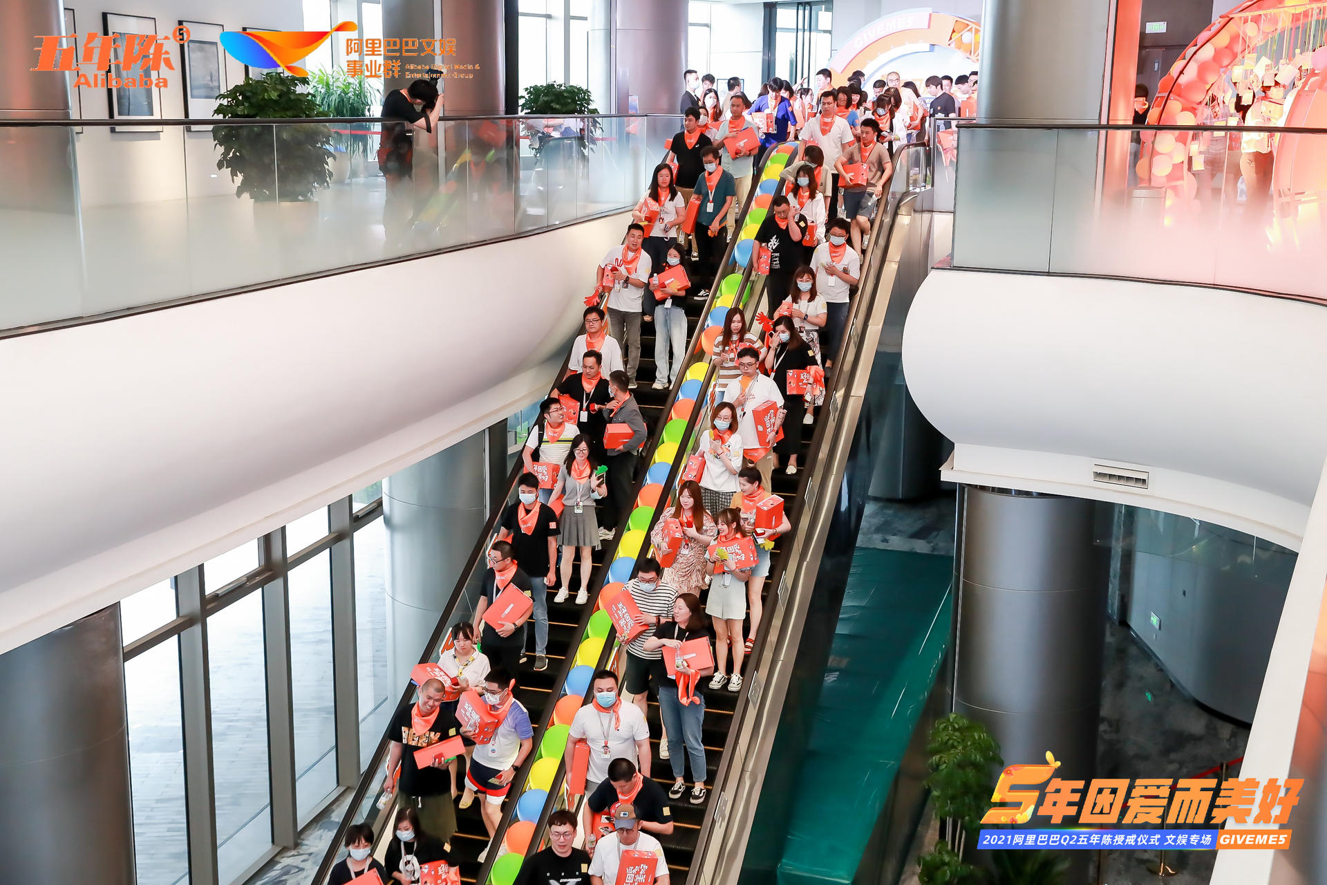 阿里人常說, “一年香,三年醇,五年陳”,我們用酒來形容阿里員工在這里的成長,這就是年陳文化。滿五年的阿里人,都會(huì)拿到一枚定制的白金戒指,它代表相信,也寓意傳承。除了戒指以外,其他環(huán)節(jié)也頗有儀式感,進(jìn)入內(nèi)場,是阿里給每一位到場員工信封拼接的活動(dòng)主題墻,信封上還用心的寫上了員工的名字,簽到領(lǐng)取五年陳定制絲巾后,即到主題墻前領(lǐng)取屬于自己的信。進(jìn)入主會(huì)場的通道不僅以“5”作為造型,里面也是大有玄機(jī),是到場員工在阿里五年的照片布置而成,員工們紛紛找到自己的照片并驚喜合影。