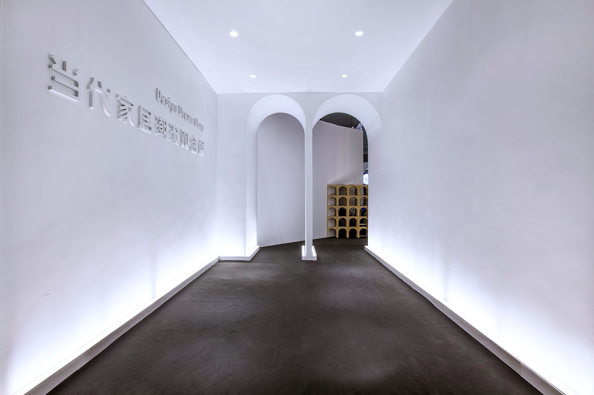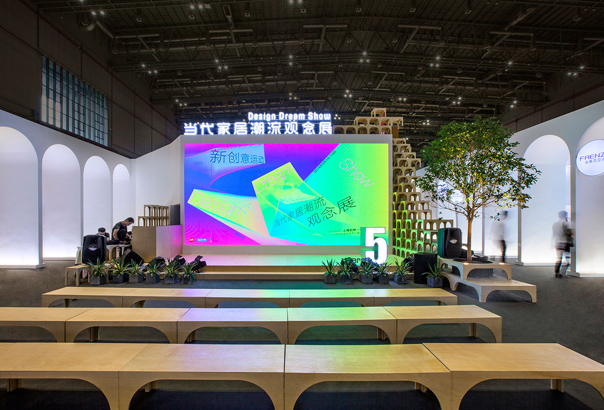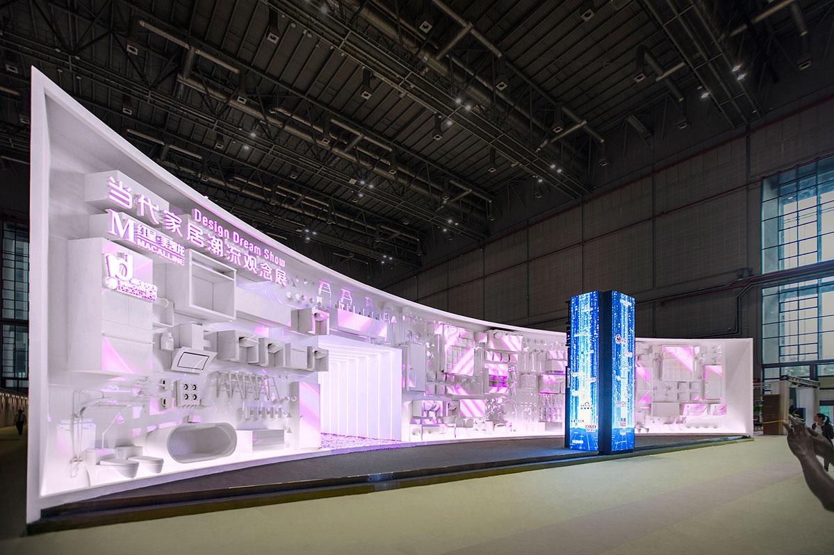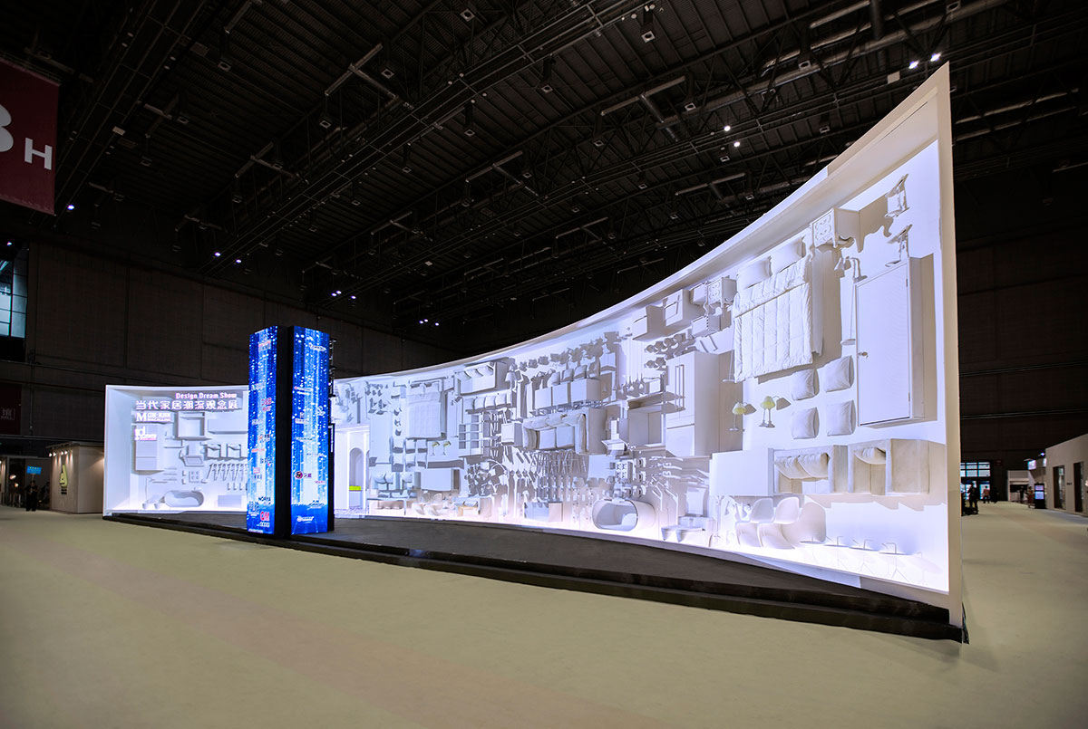 入口區(qū)域需要向參觀者展示不同的參展商產(chǎn)品,同時(shí)創(chuàng)造足夠引人注目的視覺效果以吸引他們。為此,利用參展商的廢棄家具建造了一個(gè)彎曲的家具墻 – “懸崖”。家具修好并涂成白色。結(jié)合3Dmapping技術(shù),家具墻變成了酷炫的表演。參展商的標(biāo)識(shí)不斷出現(xiàn)在支持投影機(jī)的中心支柱上,向參觀者展示了參展商的整體信息。
