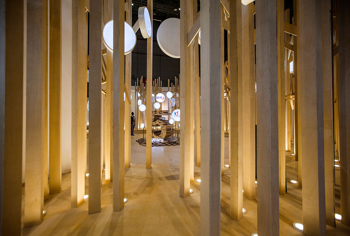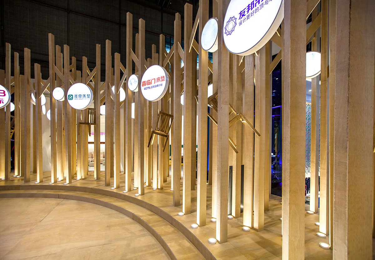第二個(gè)區(qū)域是一個(gè)圓形的“森林”,其使命是協(xié)調(diào)參展商的個(gè)性和整個(gè)展覽的主題形象。在廣場的邊緣,半透明的茂密森林般的空間由各種家具框架和垂直夾板組成,吸引游客探索隱藏在“森林”背后的展位。這樣的過渡區(qū)將廣場和展位和諧地連接起來。
