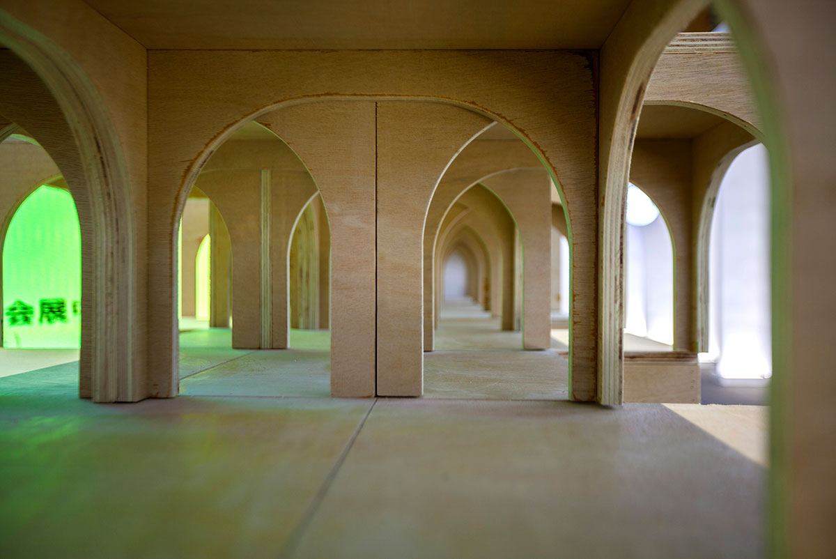 為了平衡參展商的個(gè)性以及整個(gè)展覽空間的氛圍和風(fēng)格,在木山和展覽攤位之間建造了1.5米深的拱門。一方面,拱門的有序排列與中心山丘的自由形成形成對(duì)比。另一方面,拱門的深度限制了參觀者一眼就能看到的展位數(shù)量。只有當(dāng)游客直接站在拱門前時(shí),展臺(tái)的整個(gè)空間才能完全展現(xiàn)出來。此外,拱門擋住了相鄰展位的大部分空間,而對(duì)于其他更遠(yuǎn)的展位,只能看到展開品牌標(biāo)識(shí)的整齊拱門。通過這種方式,建立了有序的信息獲取邏輯,并實(shí)現(xiàn)了共性與個(gè)性之間的平衡。
