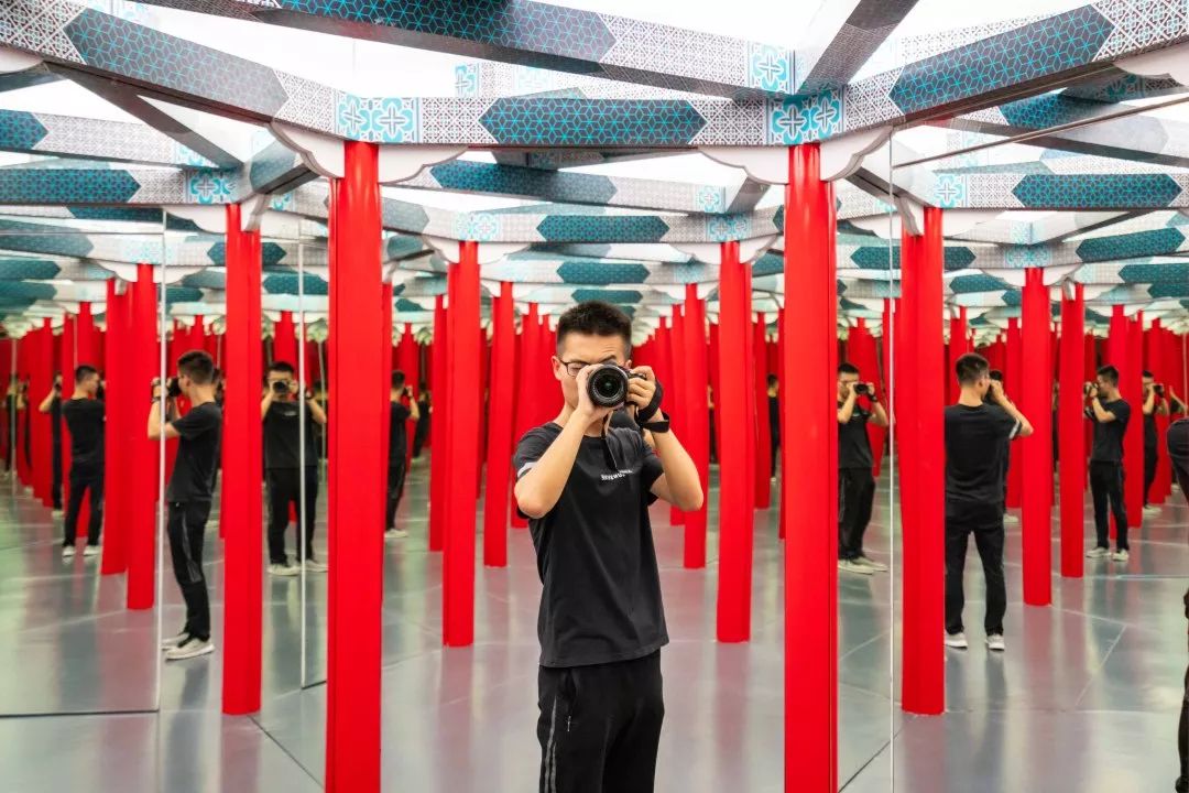 這個無限延伸的空間是MOI幻覺藝術博物館專門為中國館打造的無限屋裝置,無數(shù)個你同時出現(xiàn)在了房間里,而且四周都是耀眼的紅,拍照打卡絕對顯白到不行!