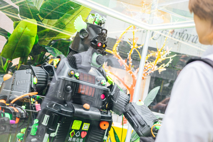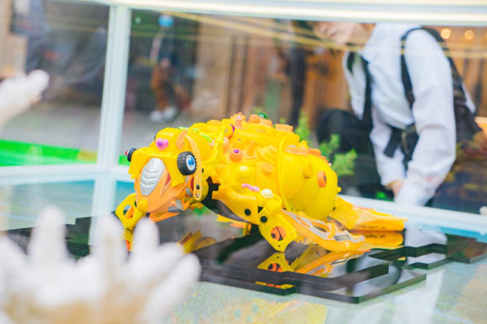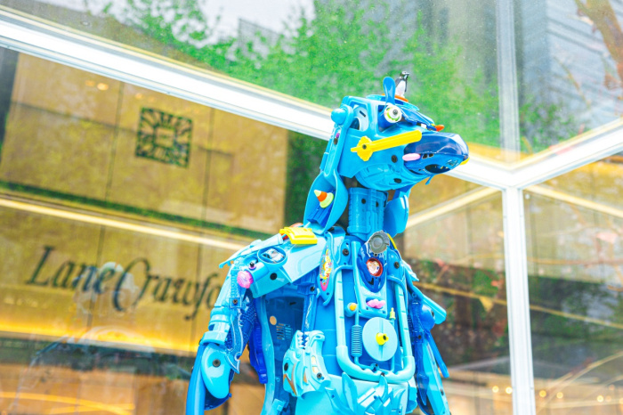 現(xiàn)場讓人移不開目光的,還有這位威武有力的帝企鵝。由飛機玩具,水槍等組成肅穆的神情、筆直的身軀,就像是一位正在守衛(wèi)族群的統(tǒng)領(lǐng)。通體標志性的海洋藍,似乎也在提醒著大家,要守護海洋、守護水資源。