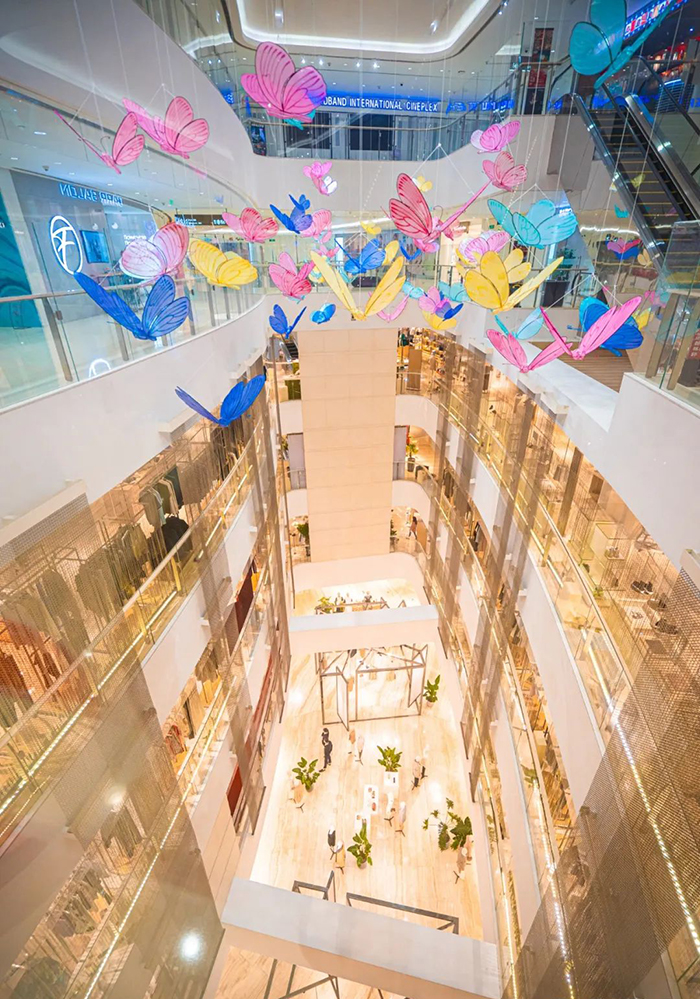 裝置展中還有翩翩起舞的蝴蝶,代表著對未來的愛和期望。同時,商場里還有更多驚喜等邂逅。抬頭便是出乎意料的美景,夢幻的蝴蝶漂浮在半空中,一直延伸到商場的頂部,讓人感覺仿佛陷入了春日花園。