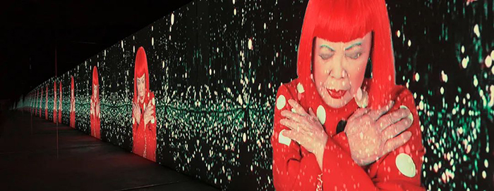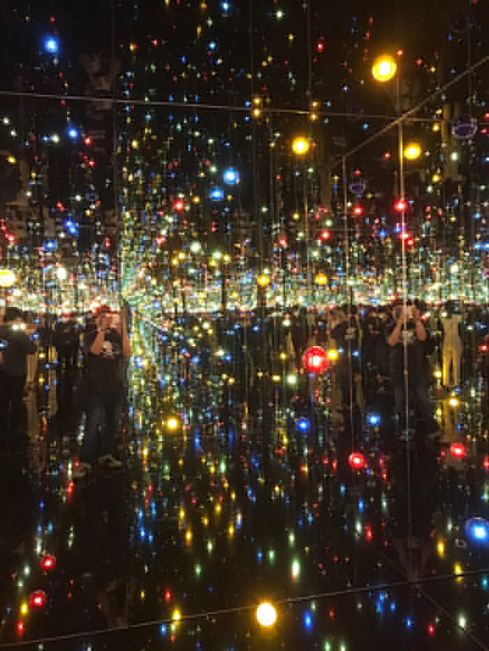 另外一個(gè)草間彌生創(chuàng)建的裝置藝術(shù)作品《無(wú)限之鏡之間-從宇宙的彼方召喚來(lái)的人類(lèi)的幸福的愿望》,繪畫(huà)的則是草間彌生對(duì)宇宙和未知世界的渴望,跑進(jìn)鏡室,仿佛置身于無(wú)限宇宙的星塵之中,轉(zhuǎn)讓人忘記了恐懼,只剩下眼睛不給的幻影。