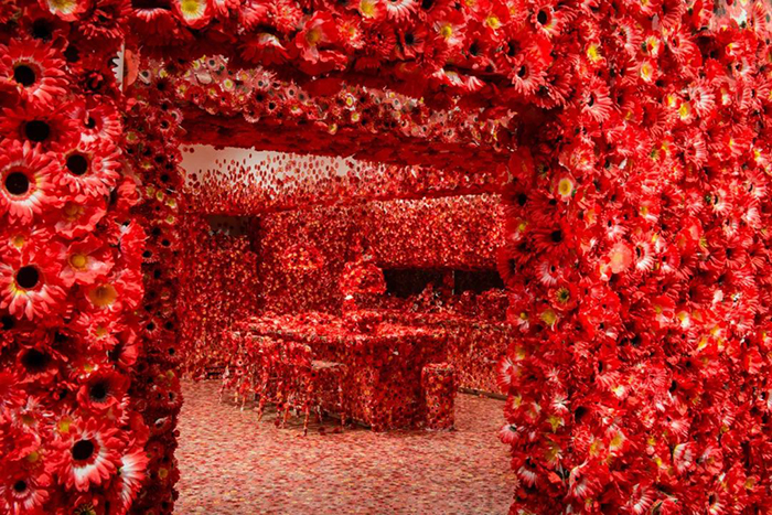 其中,在從2009年起便開(kāi)始的《わが永遠(yuǎn)の魂》系列畫(huà)作中,草間彌生將他內(nèi)心世界的幻象,一一傾瀉而出,化成一幅幅一平方公尺大小的大型畫(huà)作,整齊陳列著,與大家分享他過(guò)往心理活動(dòng)的起伏、變化。而在他最新的裝置藝術(shù)作品《フラワー?オブセッション(FLOWEROBSESSION)》中,他將覆蓋了整個(gè)房間的圓點(diǎn),換成鮮艷色彩的花朵,從地板到天花板全都是他對(duì)花朵的迷戀與癡迷,讓人分不清楚,現(xiàn)在究竟是身處于花海之中,還是另一個(gè)幻象世界。