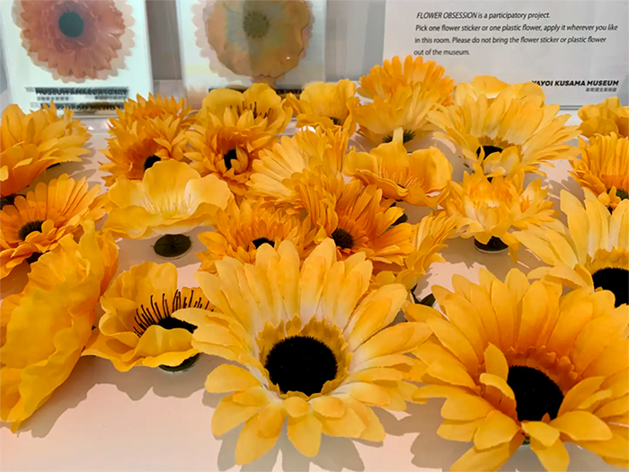 在4樓,能體驗(yàn)到首次公開(kāi)的參與型作品《插花大會(huì)》(2017年/22020年)。本作是草間彌生曾經(jīng)在自傳中說(shuō)過(guò)的,桌布的花紋在房間里增殖的幻覺(jué)視覺(jué)作品化的作品。觀賞者可以將花的標(biāo)簽或鮮花帶入房間,貼在自己喜歡的地方。隨著時(shí)間的流逝,花也增加了,漸漸接近了草間的視覺(jué)。