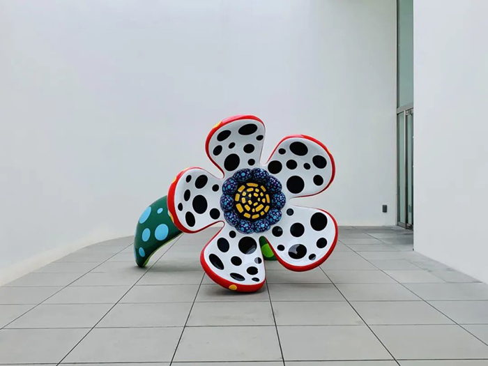 展品包括位于1樓入口處的《永遠(yuǎn)に続く女の魂》,通過(guò)鋁鑄制制成女性輪廓,仿佛漂浮在空中的輕盈感,用色鮮明強(qiáng)烈。美術(shù)館4樓也有立體的《天空にささげたわたしの心のすべてをかたる花たち》銅鑄造作品。兩件作品都是草間彌生于2020年創(chuàng)作的,看來(lái)她近年喜歡利用鋁及青銅的材質(zhì)創(chuàng)作。