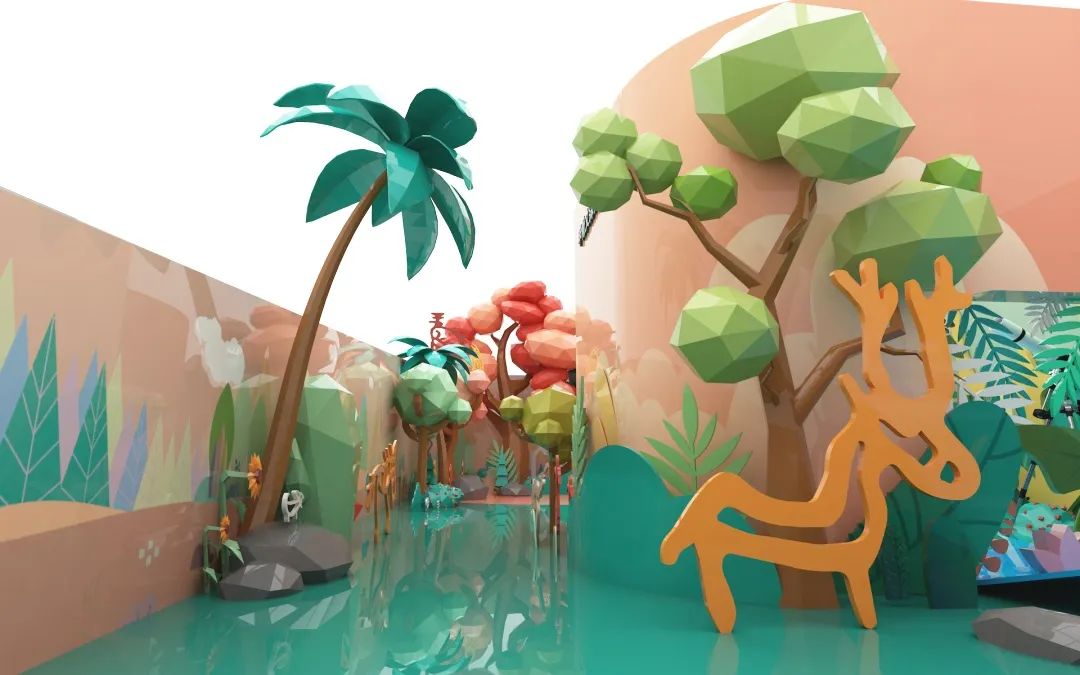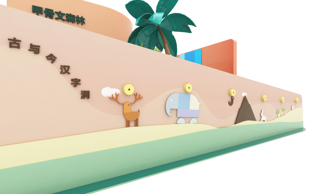 甲骨文森林:步入甲骨文森林,漫步于奇幻繽紛的野外世界,欣賞獨(dú)有的甲骨文動(dòng)物。以剪紙?jiān)貫殪`感,打造俏皮可愛的場(chǎng)景設(shè)計(jì),契合親子互動(dòng)的氣質(zhì)。