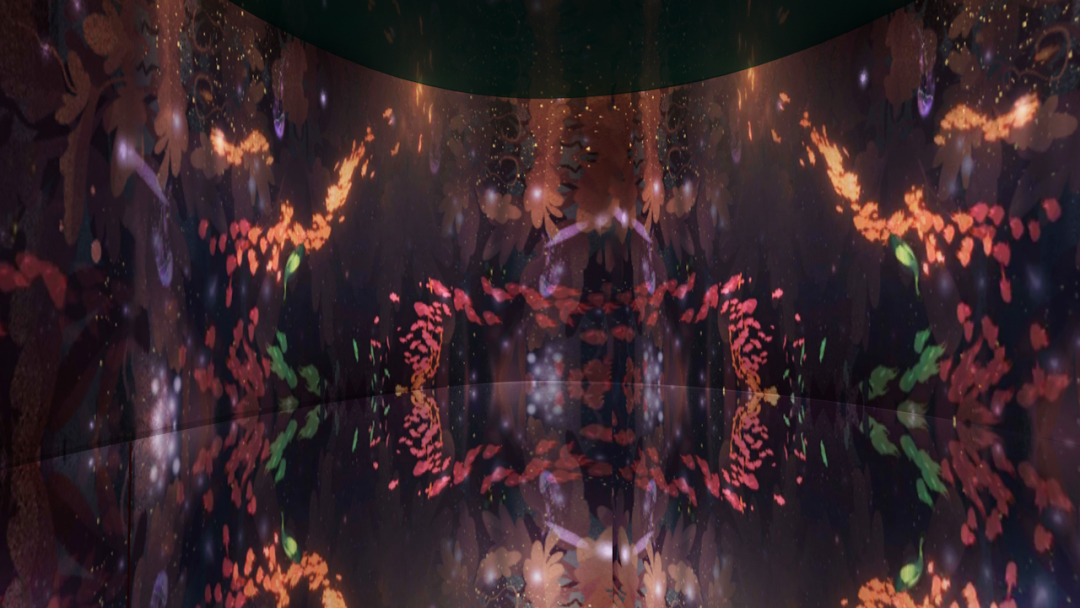 深海古漢字?:從森林到深海,進(jìn)入體驗(yàn)感完全不同的空間,尋找關(guān)于遠(yuǎn)古魚類的漢字,投影技術(shù)與鏡面反射所打造的一片古魚遨游的深海,成群的古魚經(jīng)過手部觸碰,幻化成游動(dòng)的漢字群。