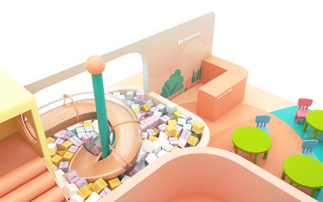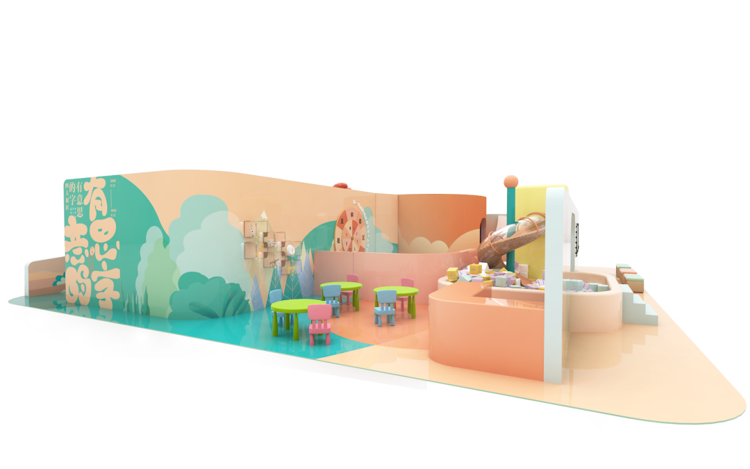 偏旁部首游樂園:辶字桌與亻日歷所呈現(xiàn)的各類偏旁部首可重新合成漢字,體驗(yàn)組合漢字的奇妙樂趣。右側(cè)空間為漢字滑梯,可滑入象形字海洋池中,置身于在六面不同的方塊字中,組合方塊,隨意拼字。