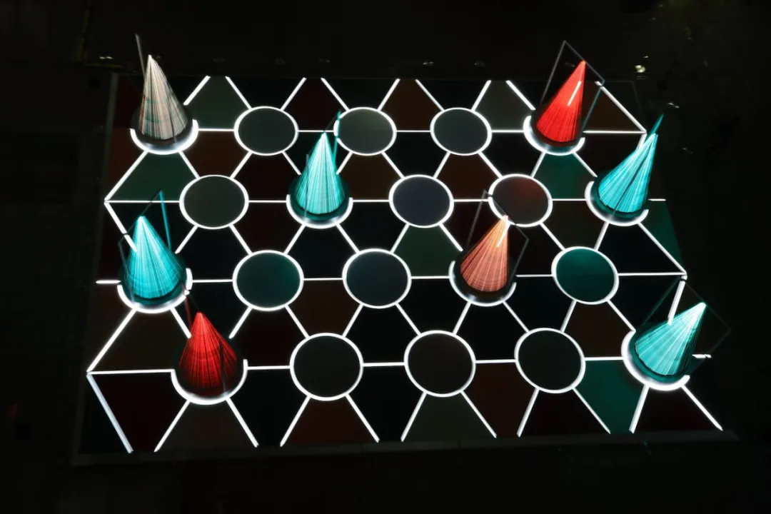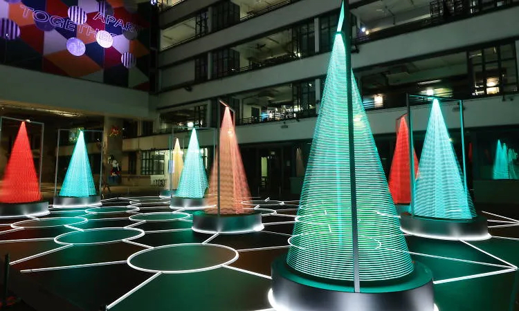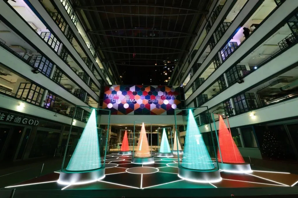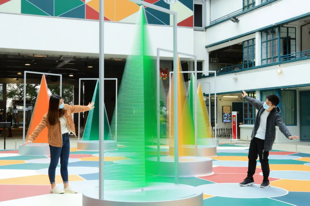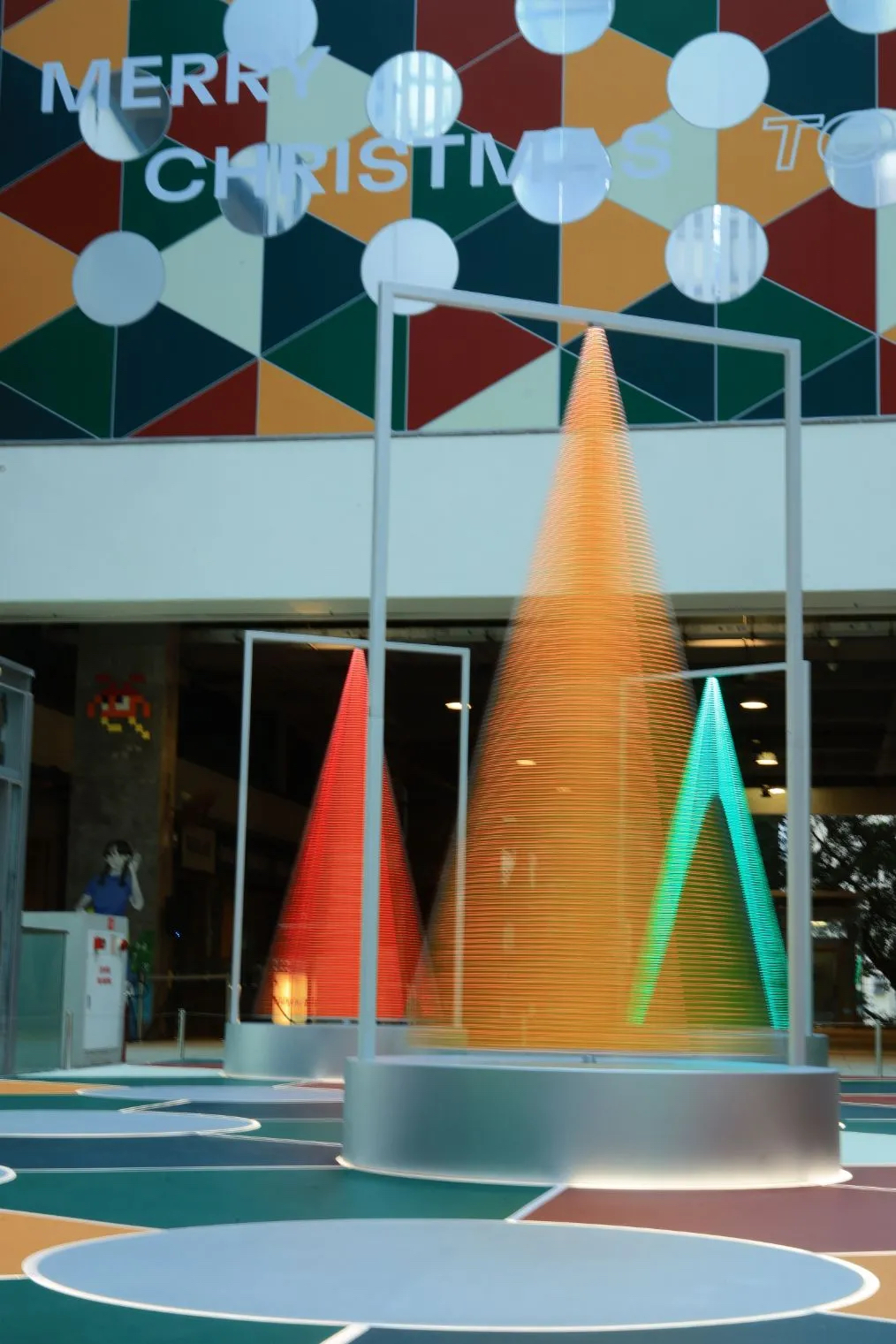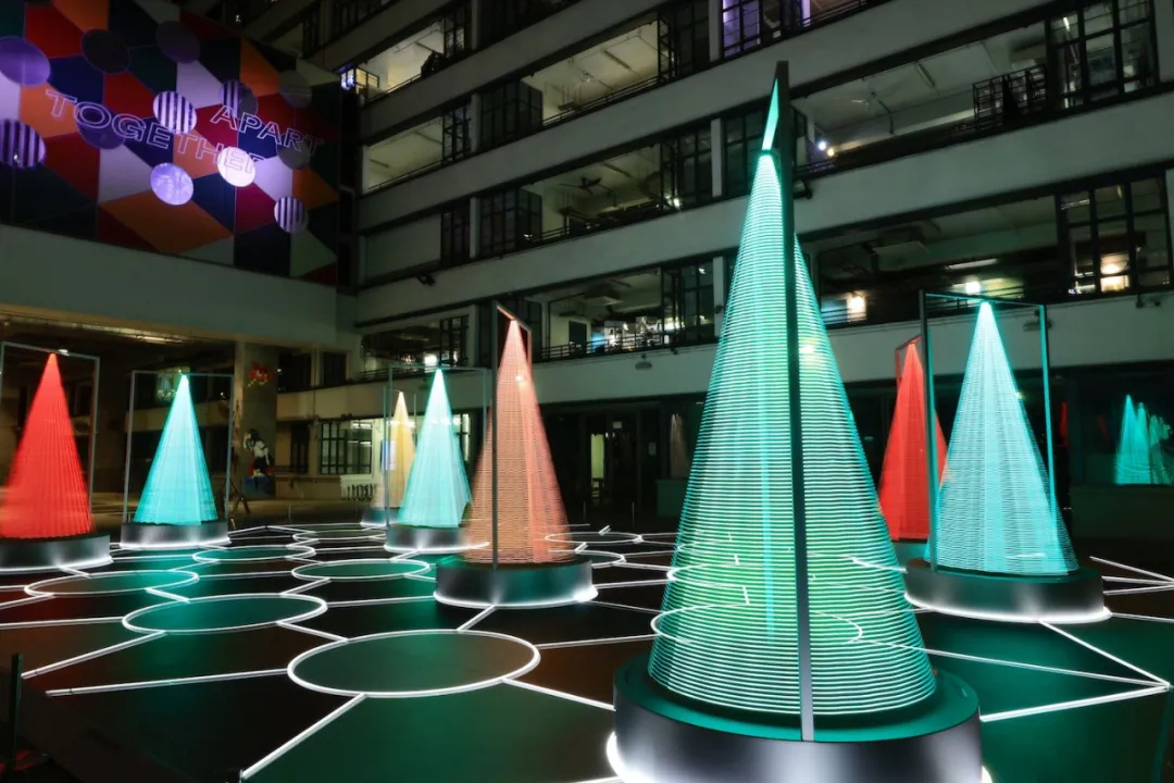 香港中環(huán)的PMQ與香港設(shè)計(jì)團(tuán)隊(duì)littleurbanmountain合作,設(shè)計(jì)出「Merry Apart ChristmasTogether」圣誕裝置。圣誕裝置以八棵簡(jiǎn)約造型的圣誕樹(shù)組成,每棵彼此相隔一米距離。簡(jiǎn)約的造型,8棵圣誕樹(shù)透過(guò)自轉(zhuǎn)轉(zhuǎn)動(dòng),產(chǎn)生立體的視覺(jué)效果,每到晚上,樹(shù)上的燈光會(huì)亮起,大家可以在夢(mèng)幻流光的圣誕氛圍中,讓人重新審視「距離」與人的連接,既然圣誕是個(gè)分享愛(ài)的節(jié)日,就讓大家用「距離感」來(lái)慶祝,也是疫情期間「愛(ài)」的表達(dá)。設(shè)計(jì)團(tuán)隊(duì)于地下圖案及圣誕樹(shù),用上橙、綠、黃、藍(lán)色等大量繽紛顏色,希望裝置于困難時(shí)刻給大家不一樣的開(kāi)心及希望感覺(jué),于節(jié)日期間揮走心中那點(diǎn)點(diǎn)灰暗情緒。