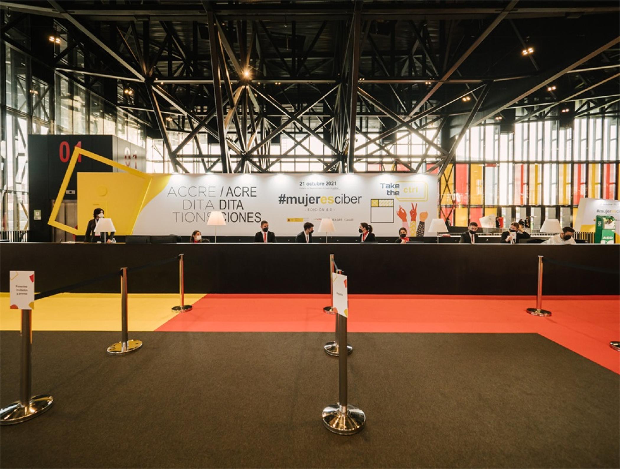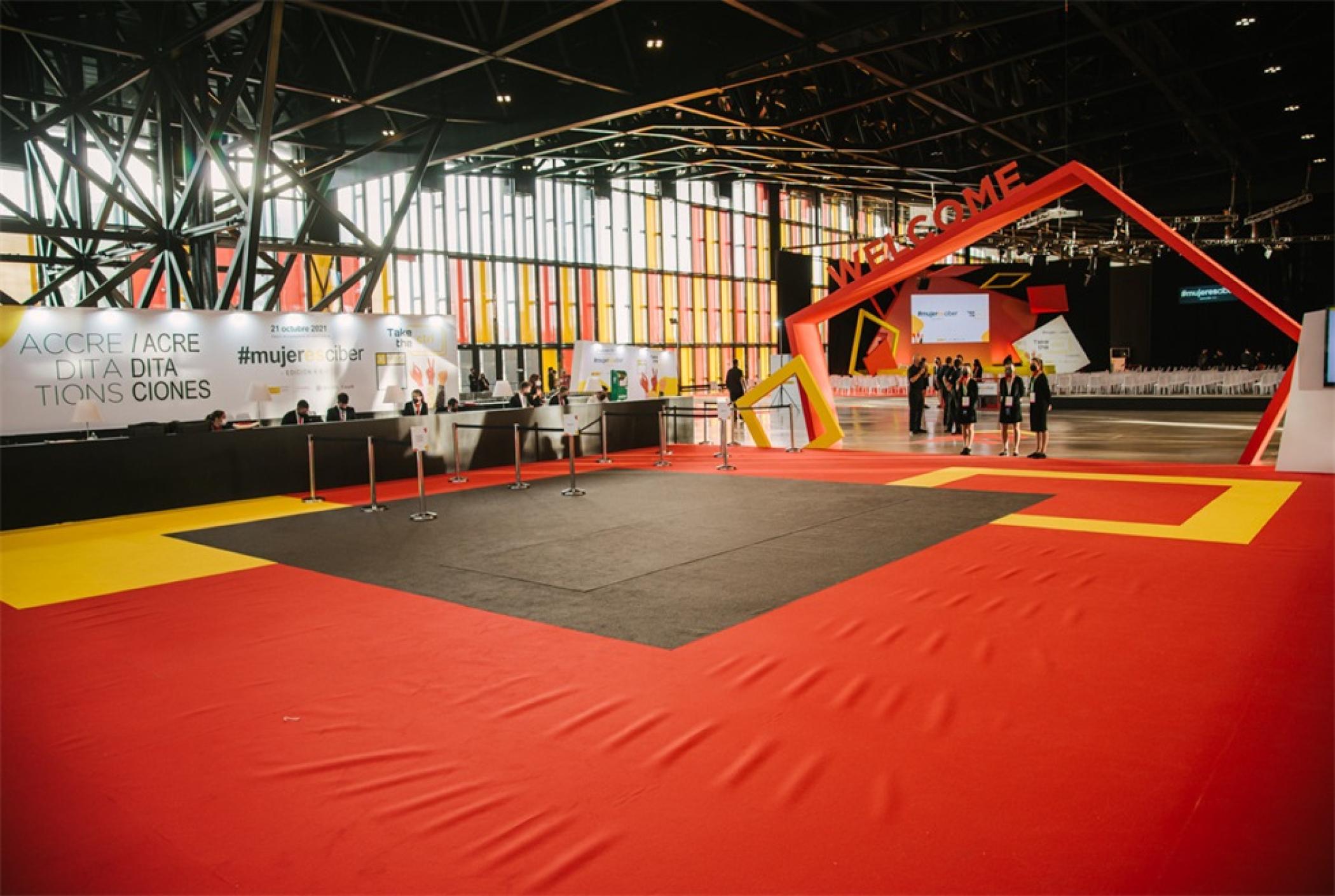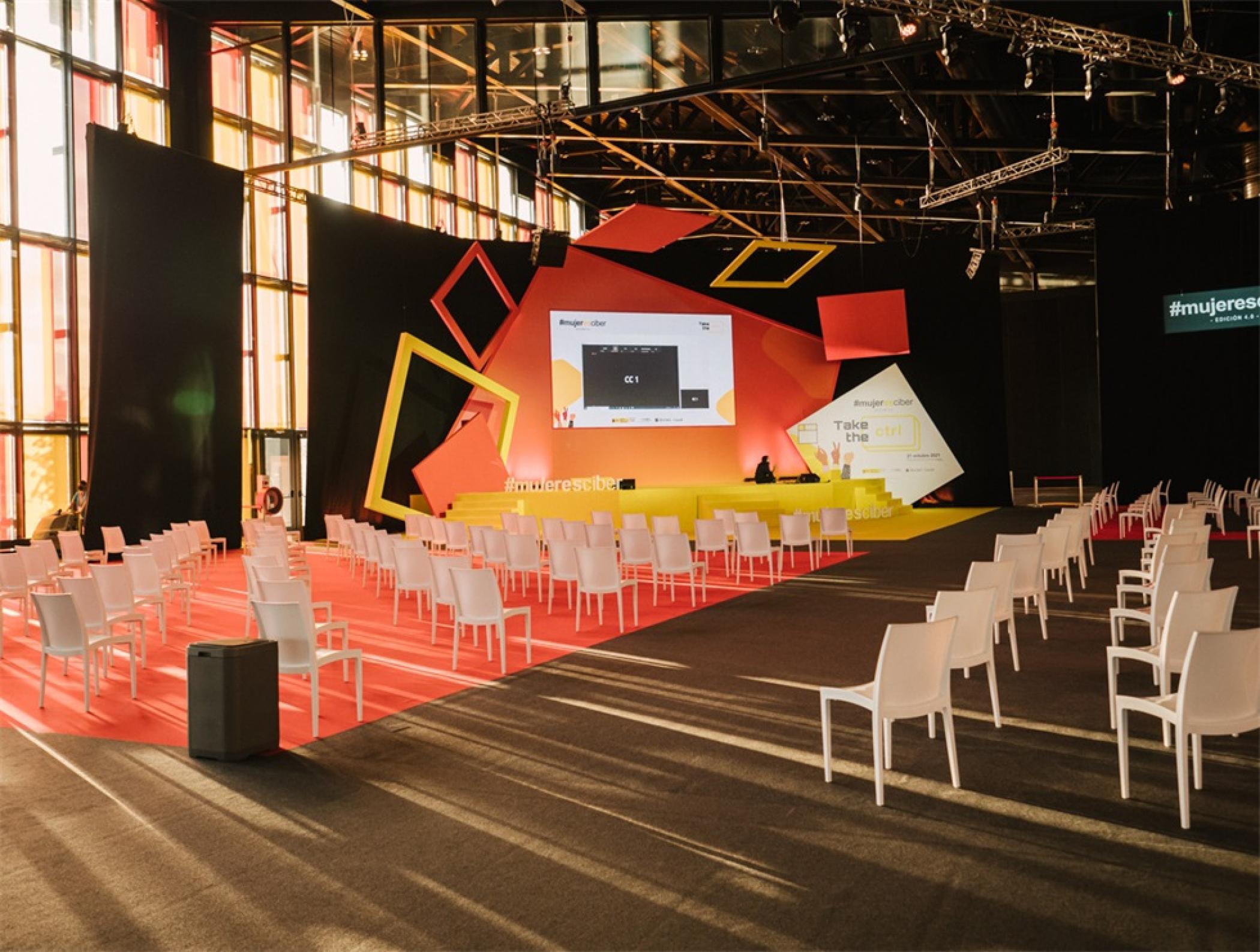 一個梯形形狀的圖形和INCIBE標(biāo)志的解構(gòu)圖形構(gòu)成了場地的主入口拱門。在結(jié)構(gòu)上設(shè)計了具有不規(guī)則形狀的大型結(jié)構(gòu),以拱門的形式作為進入每個空間或作為活動的視覺識別圖形,并將其運用到現(xiàn)場的其他方面如裝飾、平面圖形、標(biāo)牌等。作為裝飾和空間設(shè)計的通用視覺符號,無論是懸掛在展館中還是作為補充的裝飾,都采用了INCIBE(信息安全國際會議)徽標(biāo)的符號。同時還設(shè)計了不同的尺寸和顏色搭配:組合色或純色被隨機分散在空間的設(shè)計中,并作為一個統(tǒng)一的元素,提供平面、立體的視覺元素,并強化了INCIBE在活動中的形象。還應(yīng)用了INCIBE手冊的色系,使品牌的存在在整個路線上都清晰可見。對于外觀,則有一個圖形構(gòu)圖,將活動的圖像放在梯形上,并在場地的主入口處解構(gòu)了INCIBE標(biāo)志的細節(jié)。