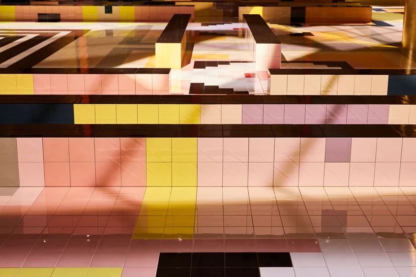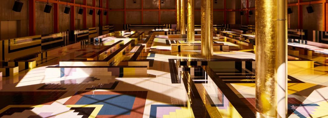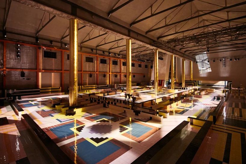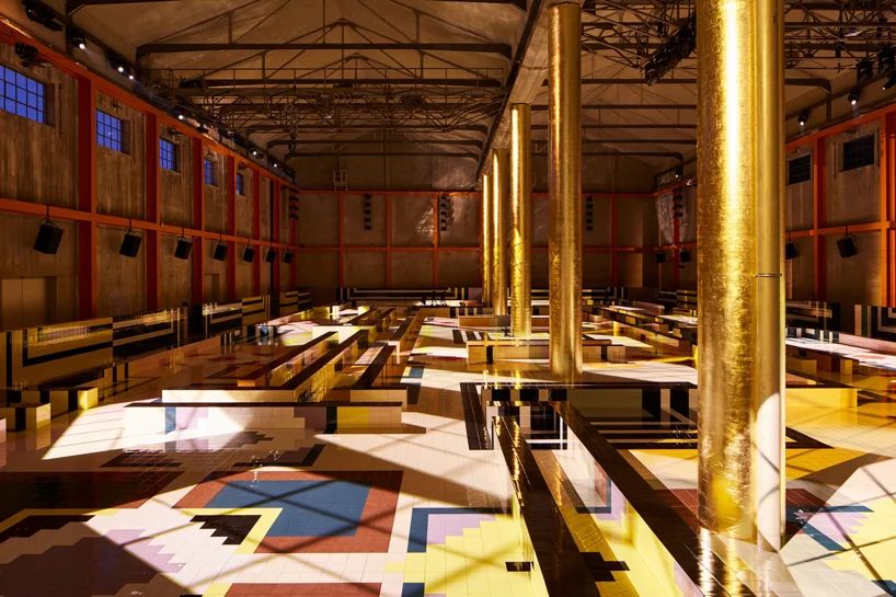 在米蘭舉辦的2020年春夏普拉達(dá)(prada)女裝秀上,活動(dòng)策劃設(shè)計(jì)了一條充滿活力、色彩斑斕的幾何t臺(tái),交叉在普拉達(dá)基金會(huì)(fondazione prada)的deposito展廳的對(duì)面。工作室使用瓷磚來裝飾場(chǎng)地的混凝土外殼,并賦予其一系列的圖案,通過夏日的輝光,照亮了覆蓋著金箔的一系列柱子。