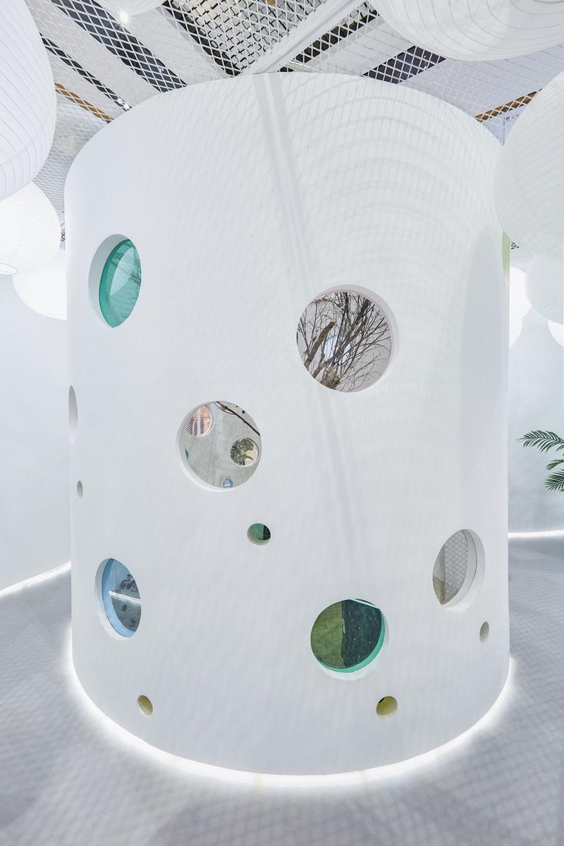 公共空間的頂部使用大尺度的白色紙燈球進(jìn)行自由隨機(jī)填充,除了從視覺(jué)上降低空間的凈高使空間尺度比例適宜以外,大量球狀的元素更能將空間柔軟化,對(duì)孩童而言更加友好親切。