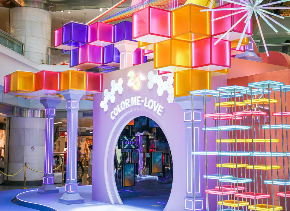 城堡分成了三個妙趣的互動區(qū)域供大家游玩打卡:城堡左側(cè)的彩虹墻上,晶瑩彩條組成“25”字樣,邀請您一同來用色彩組成圖案為天河城慶生,墻面變換的酷炫燈光像花朵一樣綻放,也是絕佳的打卡點(diǎn)之一;城堡右側(cè)是錯落的彩虹色板組成的陣列;而城堡中央,是天河城利用彩虹能量鑄成的魔法小屋,步入其中,沐浴在幻變的色彩中,二十余塊電子屏與鏡面組成的夢幻之中讓人沉浸于此,隨著夢境變化,愛意也在幻境中悄悄生長。