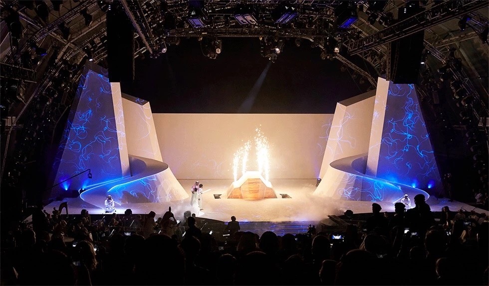 在盛典的最后一幕中,中間的背景墻被放下來,遠(yuǎn)處的山脈被戲劇化地照亮,并開始了一場奧運水準(zhǔn)的煙花和激光表演。
