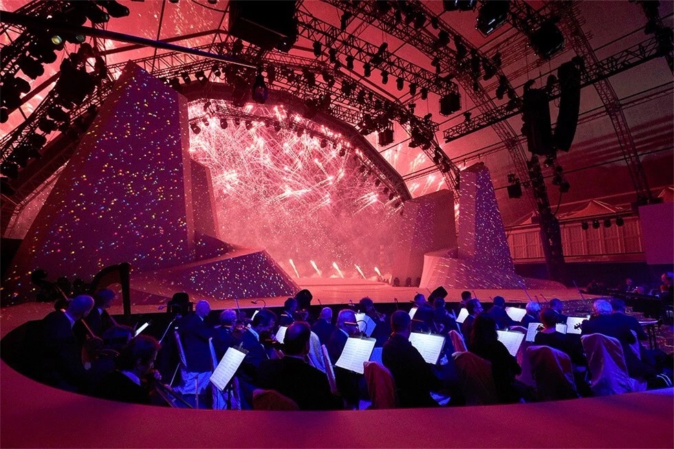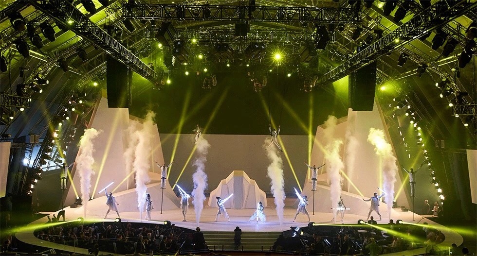 舞臺的舞美設(shè)計又是采用什么形式呈現(xiàn)這一慶典活動呢?隨小編去看看吧。此次慶典活動的舞美設(shè)計采用了沉浸式的布景,它描繪了該地區(qū)山脈的壯美之景。舞美裝置的表面,甚至包括舞臺地板,被最先進(jìn)的投影映射效果所覆蓋,配合演出活動的不同段落進(jìn)行變化。舞臺的地面還包含了嵌入式的平臺,用于風(fēng)景展示和安裝雜技表演的蹦床地板。