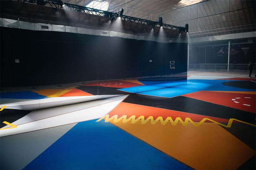 在洛杉磯發(fā)布復(fù)古款Jordan1時(shí),主辦方在28000平方英尺的活動(dòng)現(xiàn)場中搭建了一個(gè)40X40的鏡面立方體,它的外圍反射出了裝飾地面的撞色畫,代表了新款鞋的風(fēng)格,這里成為了粉絲們照相分享的理想背景,其內(nèi)部是復(fù)古款Jordan1的展示。