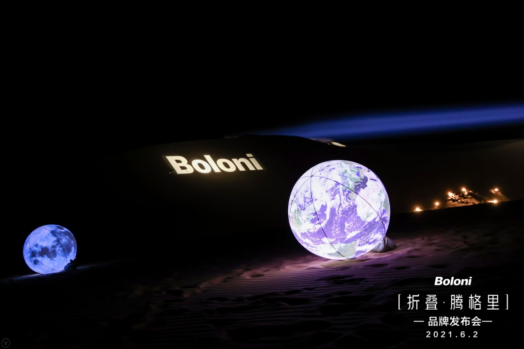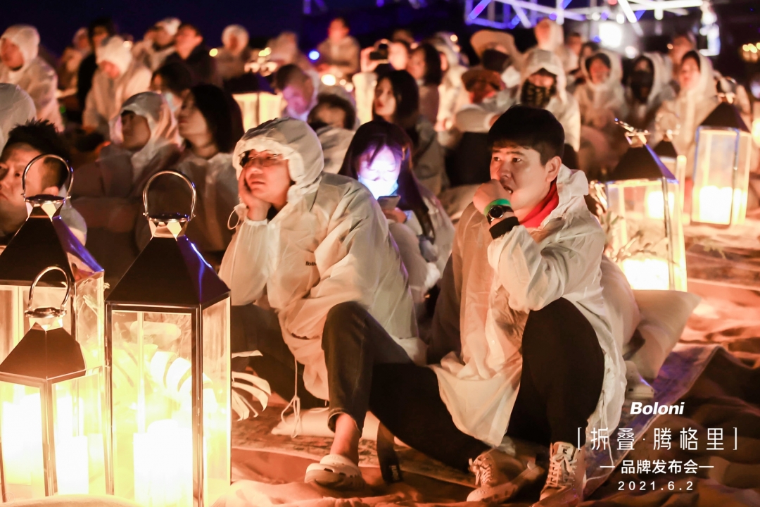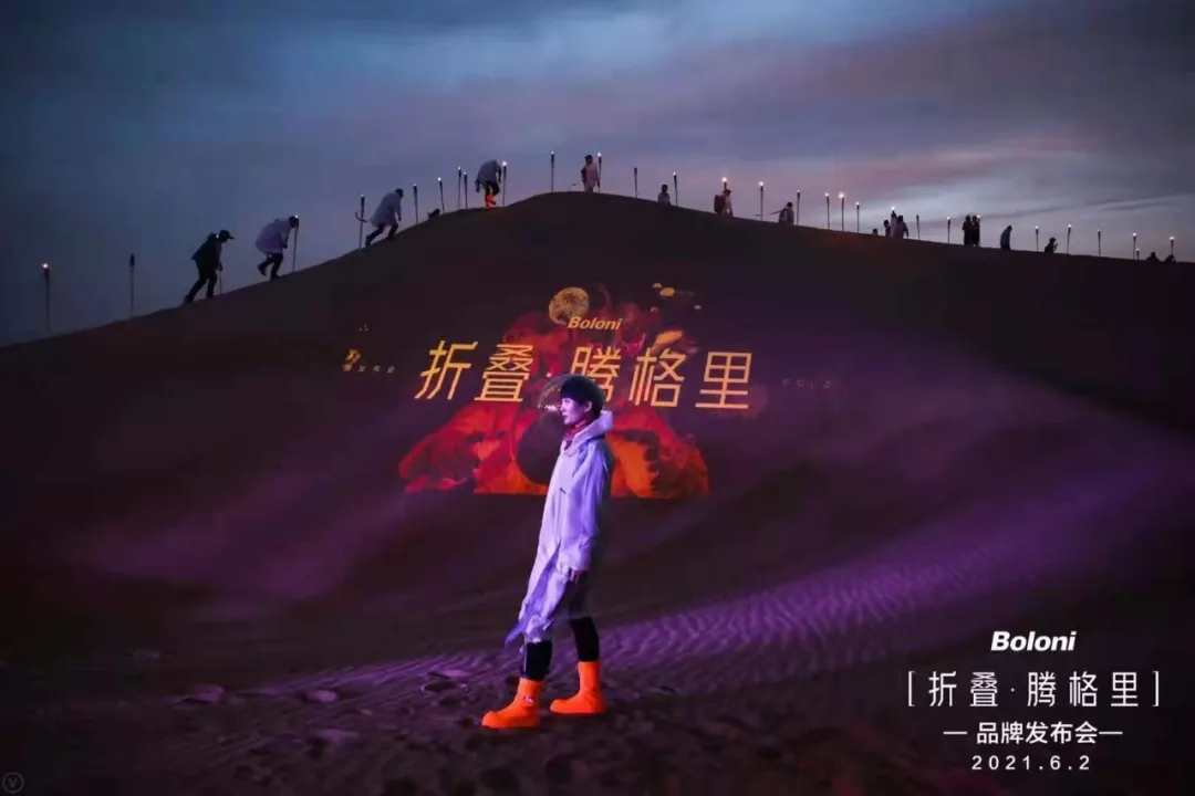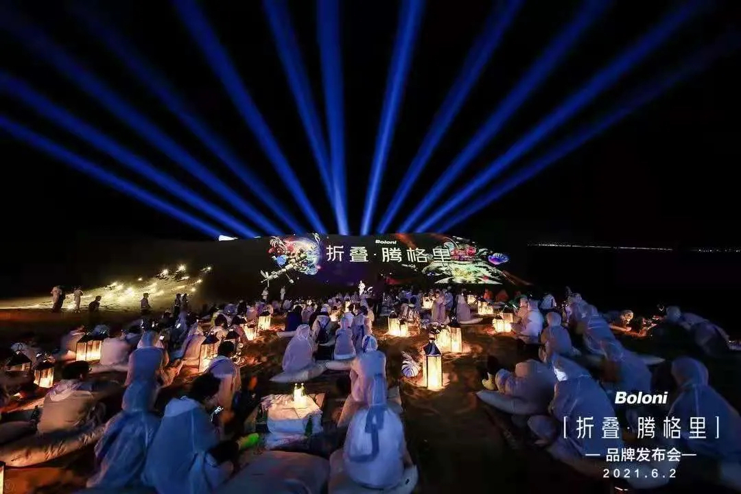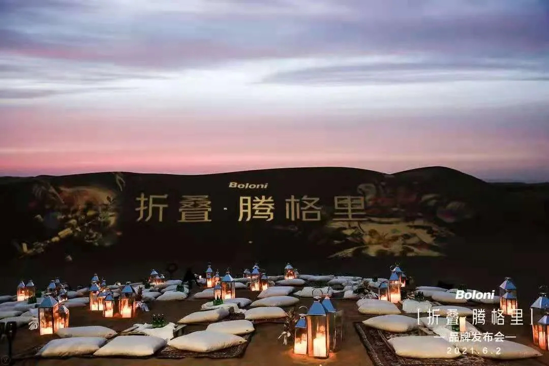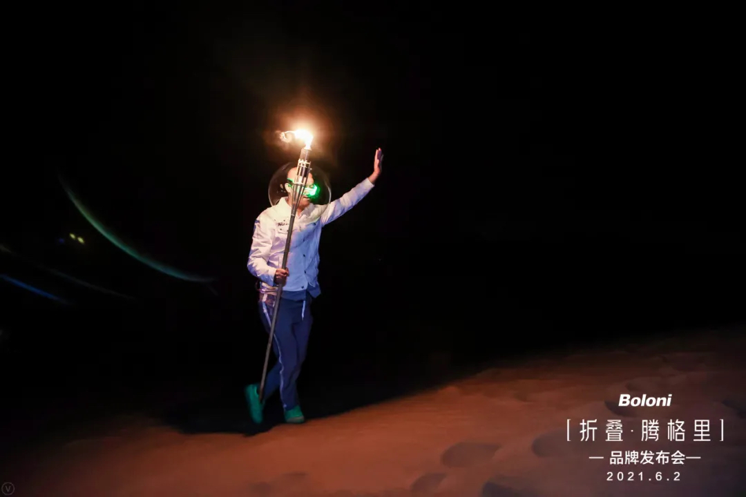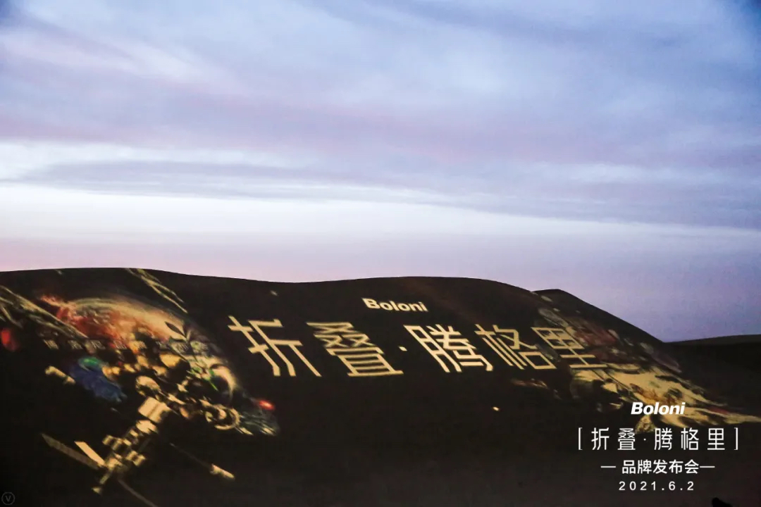 中國第四大沙漠,蒙古語意為長生天。夜晚仰視即見銀河,在臨于沙漠,仰望星河的中心。博洛尼就是在這樣的地方舉辦了2021年火星櫥柜發(fā)布會,并以讓人難以聽懂的“折疊”為主題,帶著來賓體驗一把火星上的生活。發(fā)布會是在一處沙山上舉行,以沙石作為大屏投影,來賓席地而坐,為了高度還原大家想象的火星生活,博洛尼用宇航員、火箭、透明玻璃面罩等元素給來賓打造沉浸式的參會體驗。
