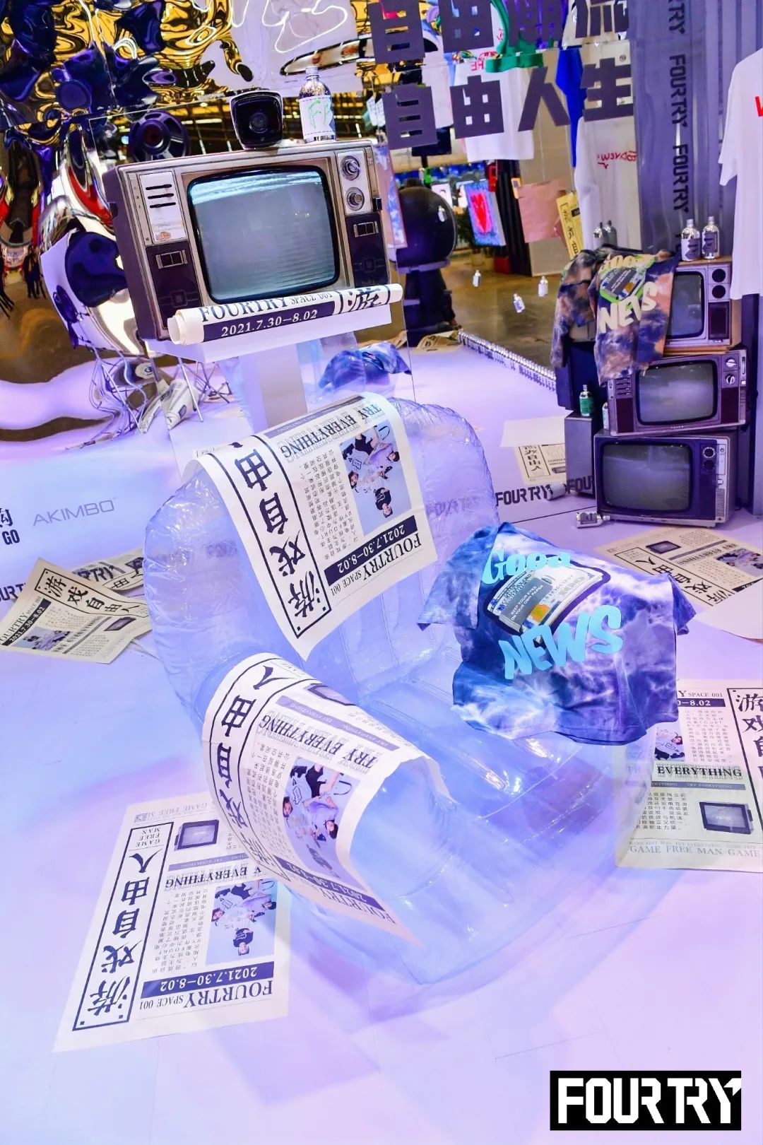 潮流藝術(shù)裝置空間體驗(yàn)區(qū)則是由:SAINT LOUIS 、HOOKYO 、GOODNEWS、心臟所、摩登地標(biāo),DOWOWGO一起共同打造:復(fù)古的電視機(jī)、彩色的游戲機(jī)、黑色的音響、發(fā)黃的報(bào)紙、透明的沙發(fā)…… FOURTRY SPACE 001構(gòu)造出一場(chǎng)對(duì)話(huà)的氛圍。我們每個(gè)人心中都留有一片秘密樂(lè)園,在樂(lè)園里我們嘗試用這些與自我對(duì)話(huà)。