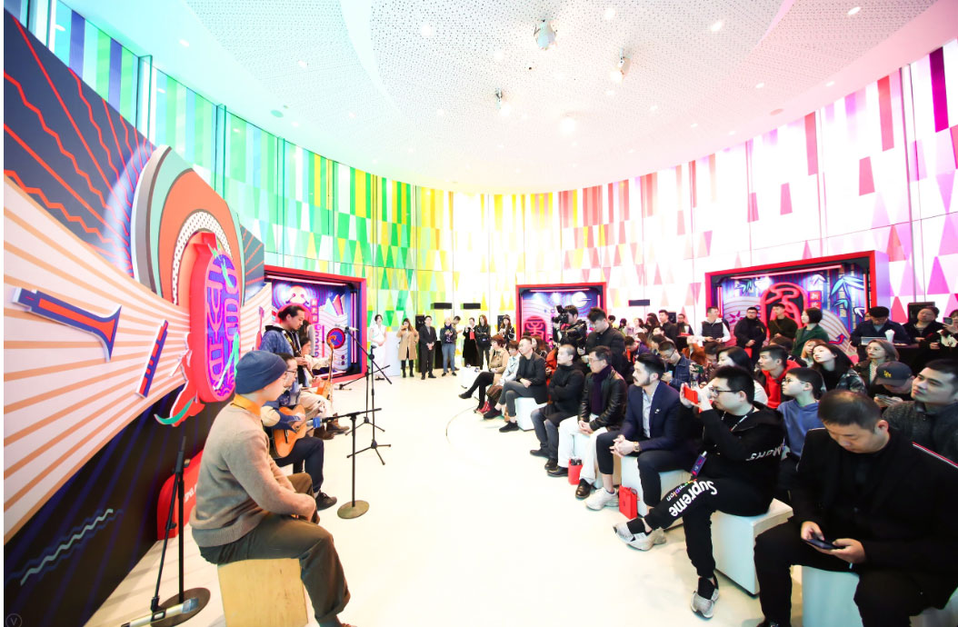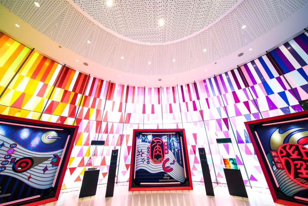 藝術(shù)展開(kāi)幕當(dāng)天,萬(wàn)花筒般絢爛的彩虹禮堂,四周是傳統(tǒng)文化中五聲音階中五個(gè)不同音的名稱的“宮商角徵羽”裝置設(shè)計(jì)。