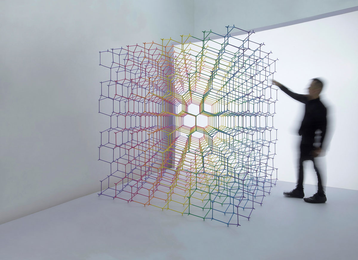 CHINAPLAS打造了由“Y”支架所建構(gòu)而成的一座超現(xiàn)實主義彩虹魔方,構(gòu)建彩虹魔方的細胞體 “Y” 支架系統(tǒng)是一個可以自由組合、無限生長成不同體量與形態(tài)的空間裝置,呈現(xiàn)出一種數(shù)字時代的未來美學(xué)價值。在這次項目中,多了色彩的支持,彩虹魔方的六種顏色傳達出了多姿多彩、開創(chuàng)精彩世界的理念。