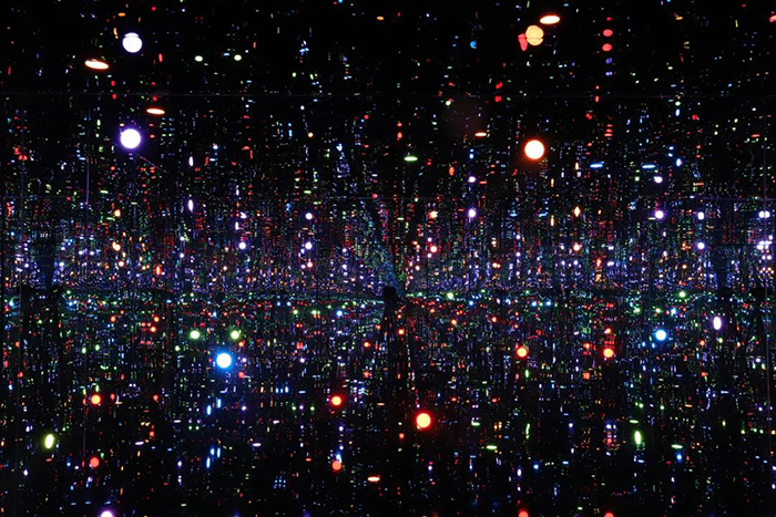 另外一個草間彌生創(chuàng)建的裝置藝術(shù)作品《無限之鏡之間-從宇宙的彼方召喚來的人類的幸福的愿望》,繪畫的則是草間彌生對宇宙和未知世界的渴望,跑進鏡室,仿佛置身于無限宇宙的星塵之中,轉(zhuǎn)讓人忘記了恐懼,只剩下眼睛不給的幻影。