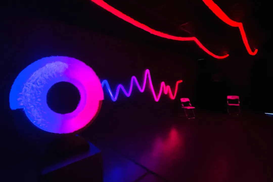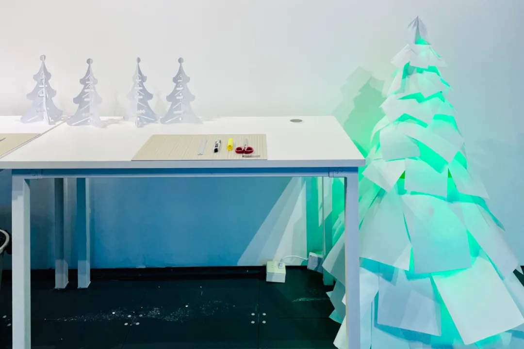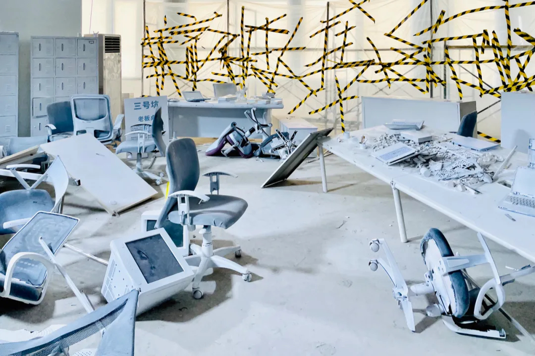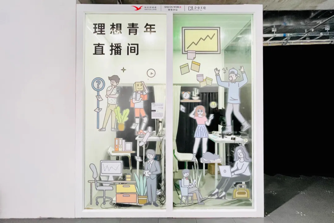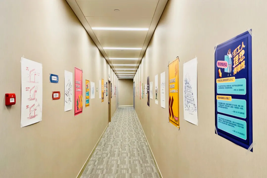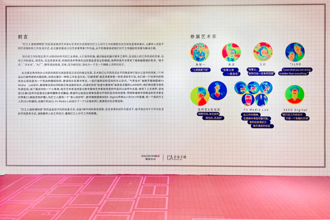 “打工人理想博物館”位于瑞虹企業(yè)天地10層,乘直達梯到達后,左轉看樣板層,右轉看“博物館”,這種體驗也是新奇。在進入到主空間之前,會在通道兩側看到很多手稿,以及從《青年理想工作空間》白皮書中摘錄的“精神語錄”,算是進入狀態(tài)前的暖場。某種程度上說,“博物館”是對“白皮書”的一種具象化的詮釋?!安┪镳^”總共7個空間,入口兩個墻面,分別是此次活動的主形象畫面、此次活動的相關介紹,以及參展藝術家。