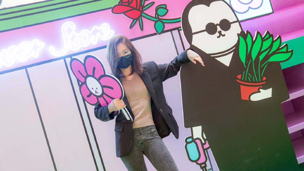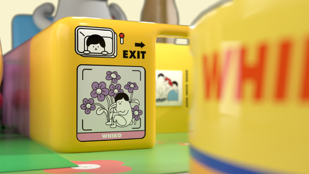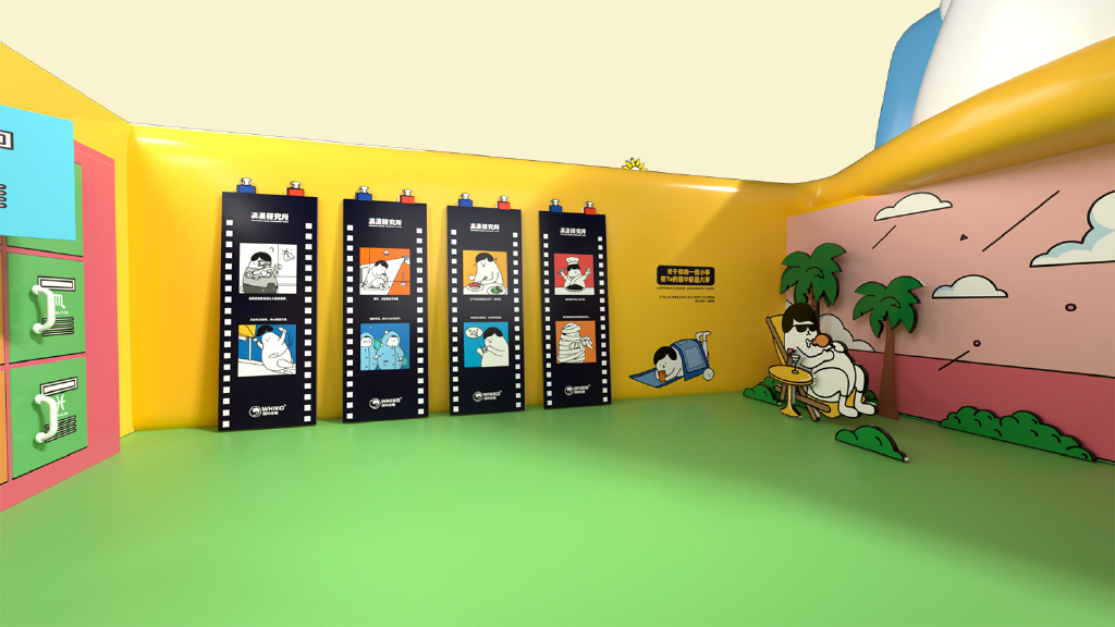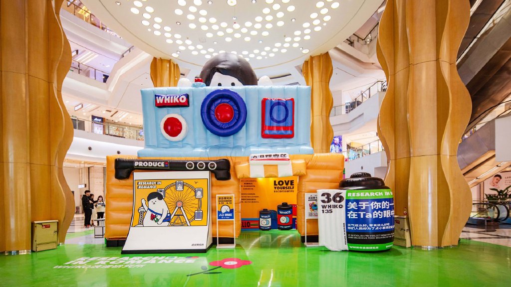 將近6米高的巨大WHIKO手持大型相機出現(xiàn)在靜安大悅城,人類穿過相機便進入了WHIKO的「浪漫研究所」當中。展覽的主展區(qū)由四個部分組成,分別展示W(wǎng)HIKO對浪漫的不同定義,每一個主題區(qū)域都通過插畫故事繪本的形式展示了WHIKO見證浪漫的點點滴滴。