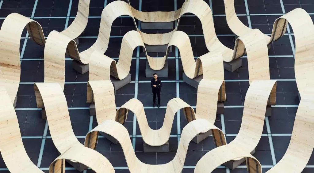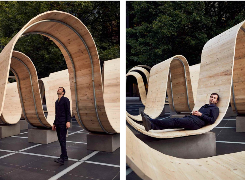“Please Be Seated 請就座”由英國著名設(shè)計(jì)師保羅?考克賽茲設(shè)計(jì)。?「請就座」是對繁忙都市生活的響應(yīng),為參觀者帶來全新的空間和社區(qū)互動(dòng)體驗(yàn)。裝置全長15.2米,呈木制大波浪形,拱起的部分可供人們穿梭其中、探索空間樂趣,彎曲的底部則成為人們放松休憩的最佳落腳點(diǎn)。作品由可持續(xù)來源的木材制成,彰顯對可持續(xù)發(fā)展的重視。