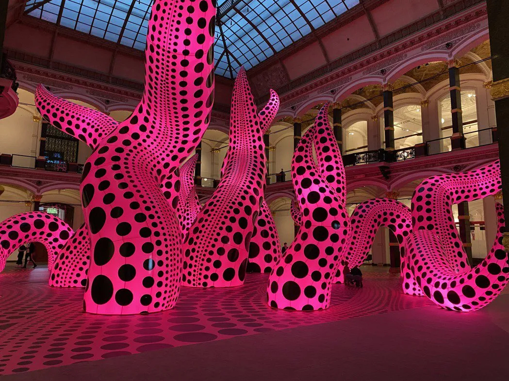 走進占地900坪的Gropius Bau美術(shù)館,中庭的裝置《A Bouquet of Love I Saw in the Universe》(我在宇宙看見的一束花朵)從地面長出桃紅色的充氣觸角,觸角上滿是黑點,這是草間彌生為此次回顧展特別創(chuàng)作的作品。與展覽同名的〈A Bouquet of Love I Saw in the Universe〉是件巨大作品,18根觸角般裝置占滿美術(shù)館大廳,最高達(dá)11米。