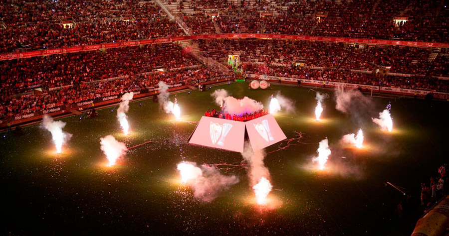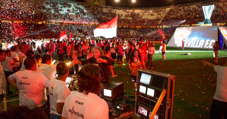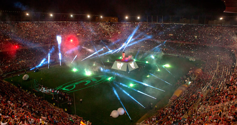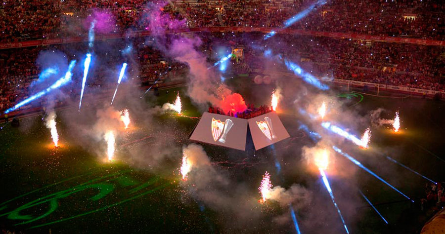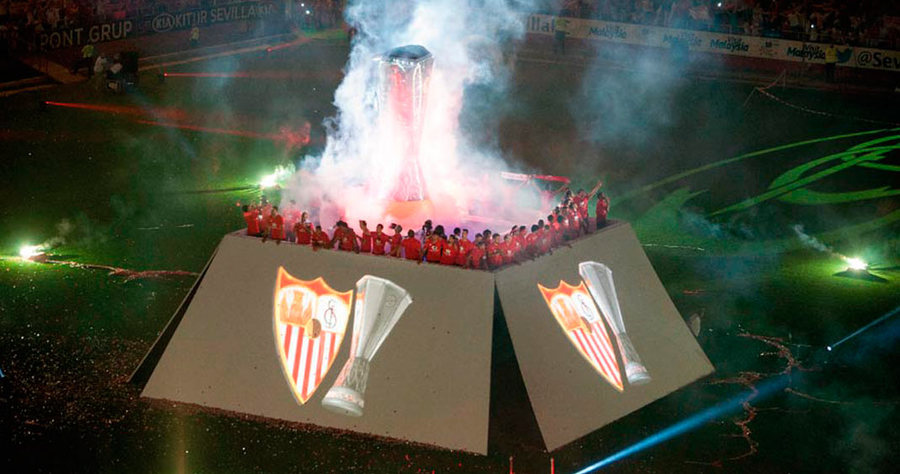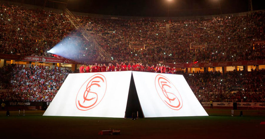 塞維利亞足球俱樂(lè)部是西甲傳統(tǒng)勁旅,在西班牙全國(guó)性的足球比賽開始之前,塞維利亞曾經(jīng)贏得17座安達(dá)魯西亞錦標(biāo)賽,以及2次獲得塞維利亞市的冠軍。在西甲聯(lián)賽成立后乃塞維利亞全盛時(shí)期,雖然只曾于1946年贏過(guò)一屆冠軍,但大部分時(shí)都在聯(lián)賽榜前列,贏過(guò)4屆西甲聯(lián)賽亞軍。此次塞維利亞足球俱樂(lè)部第五次贏得歐洲聯(lián)賽冠軍慶?;顒?dòng),在拉蒙桑切斯皮斯胡安球場(chǎng)中間搭建了一個(gè)8×8米的舞臺(tái),4個(gè)12 x5m的梯形屏幕和一個(gè)5米的聯(lián)盟杯,這樣特殊的舞美設(shè)計(jì)掀起活動(dòng)現(xiàn)場(chǎng)觀眾們的陣陣歡呼,當(dāng)晚都嗨翻天燃到爆!