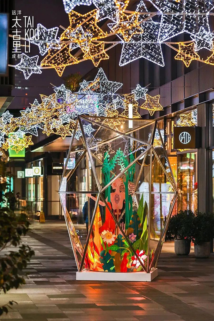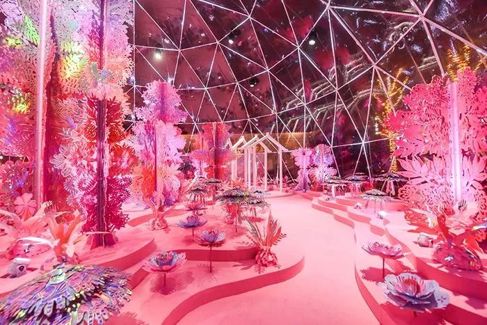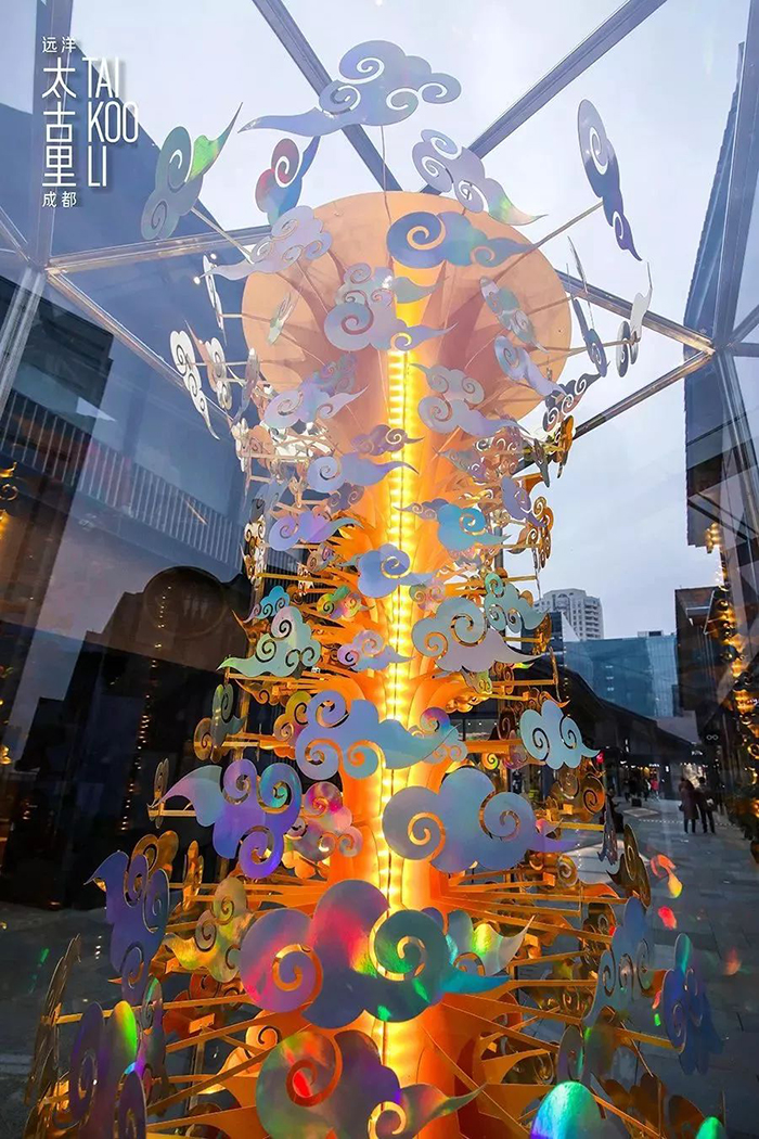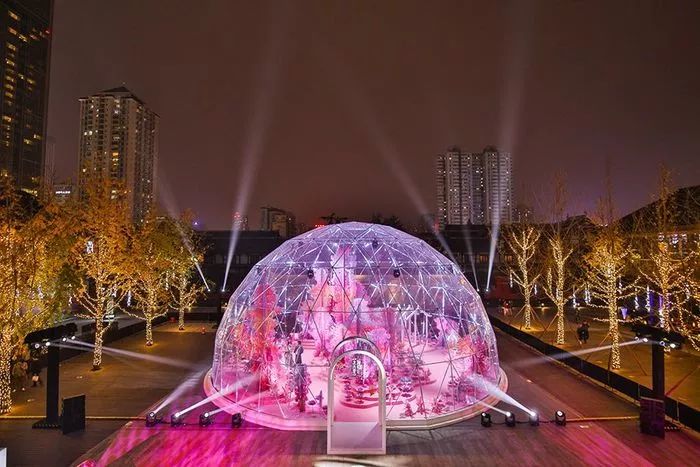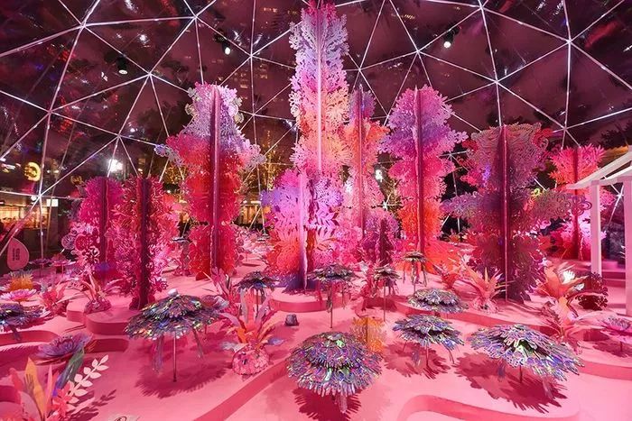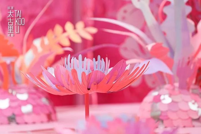 成都遠(yuǎn)洋太古里邀請中國青年知名紙藝藝術(shù)家陳粉丸,呈現(xiàn)“未來漫游,自然回響 NATURE'S LYRICS FROM THE FUTURE”主題活動。將未來城市“穿越時空”展現(xiàn)于漫廣場和里巷之中,用環(huán)保紙制裝置結(jié)合聲光影及氣味,造就一座充滿未來感的如夢森林,讓參觀者進(jìn)入了一場時光的夢影里,與時間和自然對話,探索城市與生活的理想樣本。在啟幕儀式現(xiàn)場,“未來漫游,自然回響NATURE'S LYRICS FROM THE FUTURE”公共互動主裝置于成都遠(yuǎn)洋太古里漫廣場開啟:來自未來的“氣泡森林”中,藝術(shù)家以成都遠(yuǎn)洋太古里里巷中真實的植物為藍(lán)本,提取線條造型并加入手型符號,凝練成人與自然結(jié)合的圖騰。與主裝置形成配合和呼應(yīng)的,還有散落在里巷中的“自然漫游”裝置點(diǎn):東里入口的“生命樹”,是一棵不斷生長、更新的共生之樹;南中里二層的“生如夏花”,展現(xiàn)了如夏花般絢爛不息蓬勃生長的生命;北中里二層的“云間”,用輕盈的云朵締造了通向天空的階梯;西里二層的“藍(lán)色耳朵”,用自然的聲音啟發(fā)觀眾對自然的另一種感知。此次活動的全部裝置幾乎都由回收紙或者環(huán)保紙制作,紙材均有FSC森林認(rèn)證 ,保證其原料來自經(jīng)認(rèn)證的可持續(xù)經(jīng)營的森林。同時,裝置中的板材均使用回收碎木料重新壓制,造型中也使用了回收的冰淇淋木棒等材料。展覽結(jié)束之后,一部分裝置會回到藝術(shù)家工作室二次陳列,剩下的部分將會通過回收組織處理,成為新的環(huán)保紙和板材。