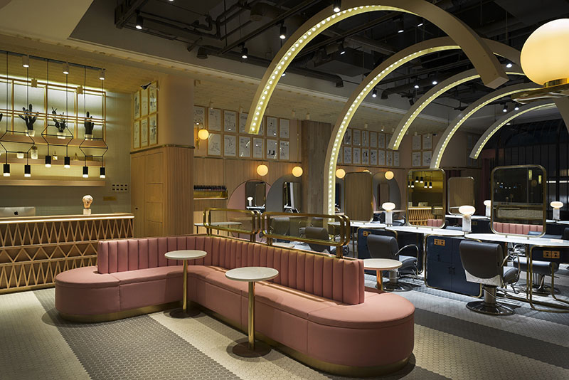 MAY& J摒棄了傳統(tǒng)理念中的歐美風(fēng)和酷炫風(fēng),通過直觀化的空間享受,巧妙地運(yùn)用了少女系的粉紅和天藍(lán)色,加以奢華的金黃色搭配,再加以燈光、鉛筆漫畫、蜂巢型的地板和更具造型意義的仙人掌進(jìn)行裝飾點(diǎn)綴,為顧客營(yíng)造出一個(gè)更舒適、更清新而又自由的新型沒發(fā)體驗(yàn)店,從視覺上、空間上,都給顧客一種全新的體驗(yàn),更是妥妥的網(wǎng)紅打卡點(diǎn)嘛!