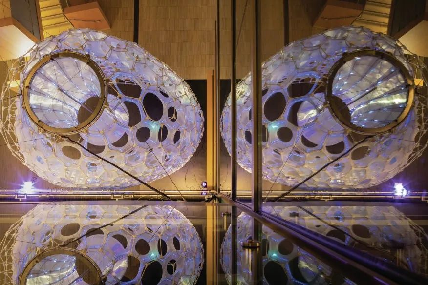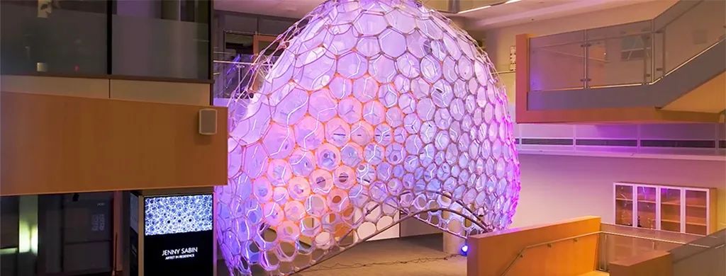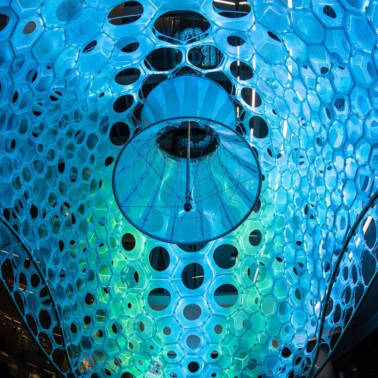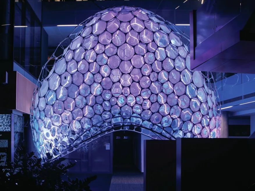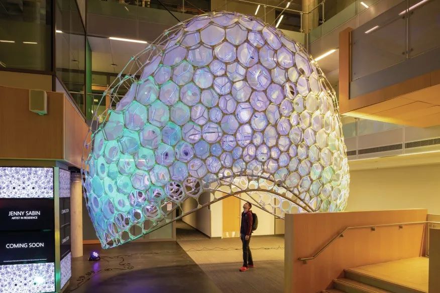 雷德蒙德園區(qū)的99號樓中空,展示了AI與建筑的融合,這是微軟的首例沉浸式裝置。該項(xiàng)目以19世紀(jì)計(jì)算機(jī)程序創(chuàng)始人Ada Lovelace的名字命名:Ada,該項(xiàng)目以19世紀(jì)計(jì)算機(jī)程序創(chuàng)始人Ada Lovelace的名字命名,由Microsoft Research駐場藝術(shù)家Jenny Sabin指導(dǎo)。這座兩層樓高的裝置藝術(shù)由3D打印節(jié)點(diǎn)、玻璃纖維桿和織物組裝而成,通過數(shù)字化編織技術(shù)融入了熒光紗線,借助人工智能技術(shù),能夠?qū)娌勘砬?、噪音、語音語調(diào)和語言在內(nèi)的匿名數(shù)據(jù)轉(zhuǎn)化為精致的光與彩之舞。這個(gè)名為 Ada 的建筑結(jié)構(gòu)重約 1800 磅(約 816 公斤),其外骨架由 895 個(gè)特制的 3D 打印節(jié)點(diǎn)組成,1274根玻璃纖維桿連接起了這些節(jié)點(diǎn),形成了由多個(gè)六邊形組成的網(wǎng)絡(luò),構(gòu)建出一個(gè)堅(jiān)固的橢圓形展示篷。熒光織物通過數(shù)字化技術(shù)編織成多孔發(fā)光網(wǎng)絡(luò),錐體通過螺栓與外骨架連接,同時(shí)向內(nèi)延伸,形成柔軟的內(nèi)墻,使 Ada 呈現(xiàn)出蜂窩狀。人工智能算法將這些數(shù)據(jù)轉(zhuǎn)化為不斷變化強(qiáng)度的色彩和光線,并通過 Ada 編制結(jié)構(gòu)中的可尋址 LED 以及周圍的舞臺燈光進(jìn)行呈現(xiàn)。??
