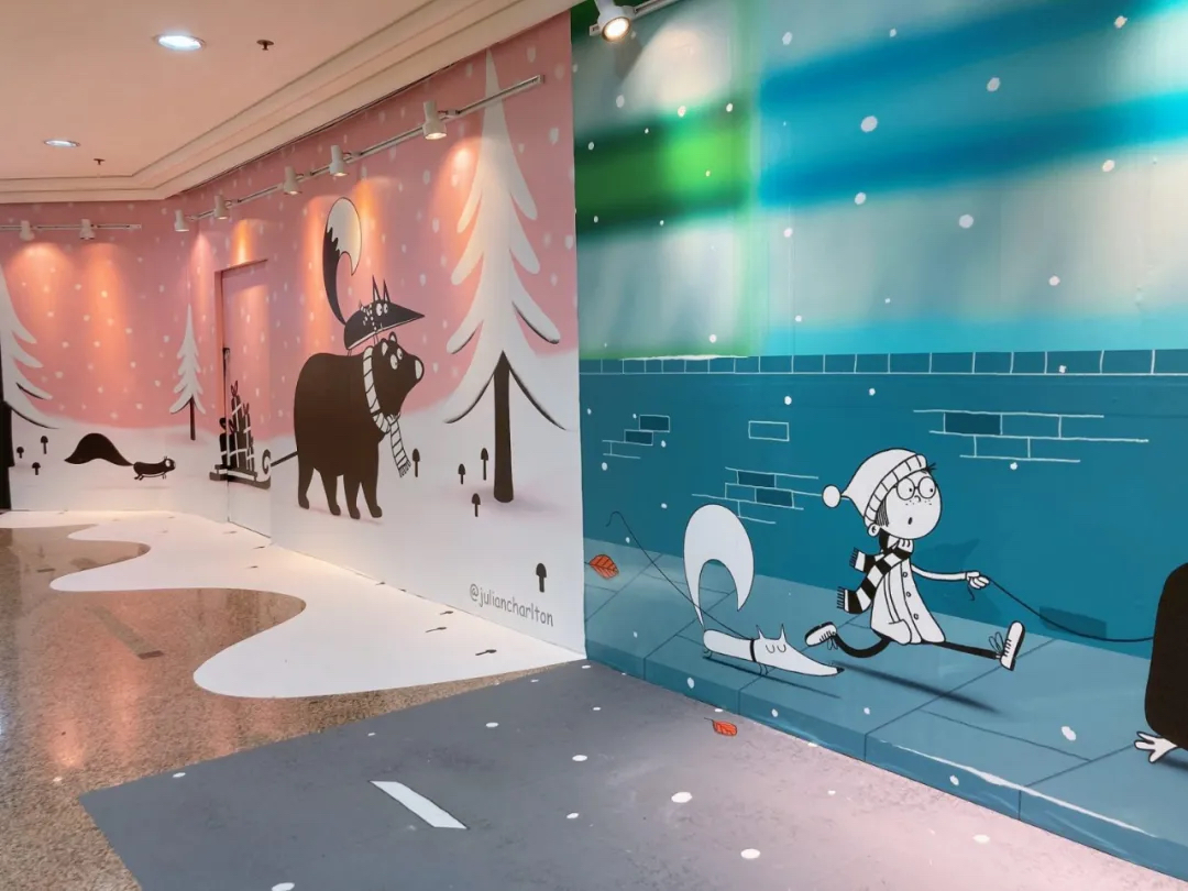 時(shí)代廣場(chǎng)也特意邀請(qǐng)英國(guó)插畫(huà)師Julian Charlton以「Warm and fun @ Winter Time」為主題,在不同樓層繪畫(huà)互動(dòng)Street Art,適合一家大細(xì)與Julian筆下的可愛(ài)幽默小動(dòng)物們打卡留念。