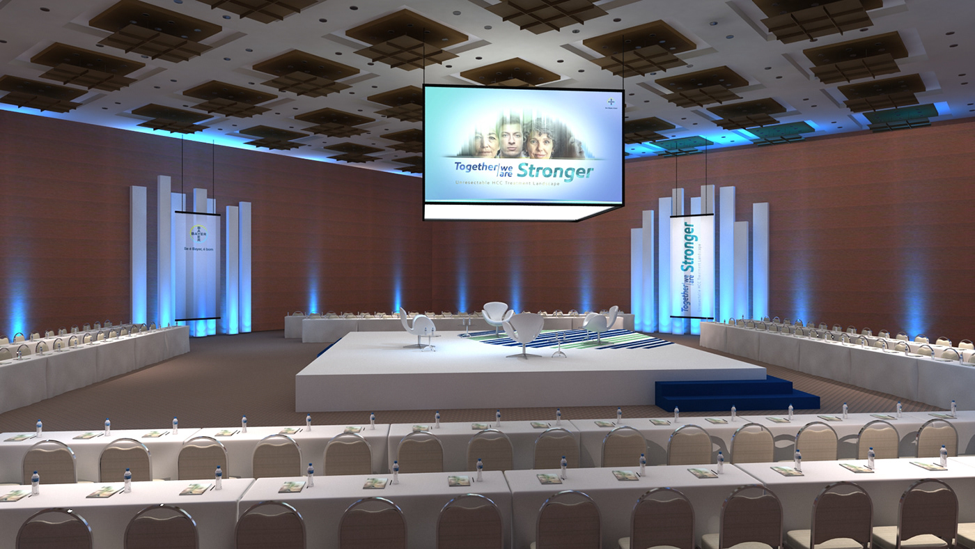 Bayer這次在活動(dòng)場(chǎng)地設(shè)計(jì)上,一改常規(guī)的課桌式或劇院式的擺放形式,采用以舞臺(tái)為中心點(diǎn),向四周發(fā)散的形式進(jìn)行場(chǎng)地設(shè)計(jì)擺放。此次的舞臺(tái)打造成四方形,大屏則以懸掛式的形式懸掛于舞臺(tái)之上,四邊的席位圍繞舞臺(tái)展開(kāi)。整個(gè)活動(dòng)場(chǎng)地以純凈的白色為主色調(diào),整體顯得簡(jiǎn)潔而大氣。