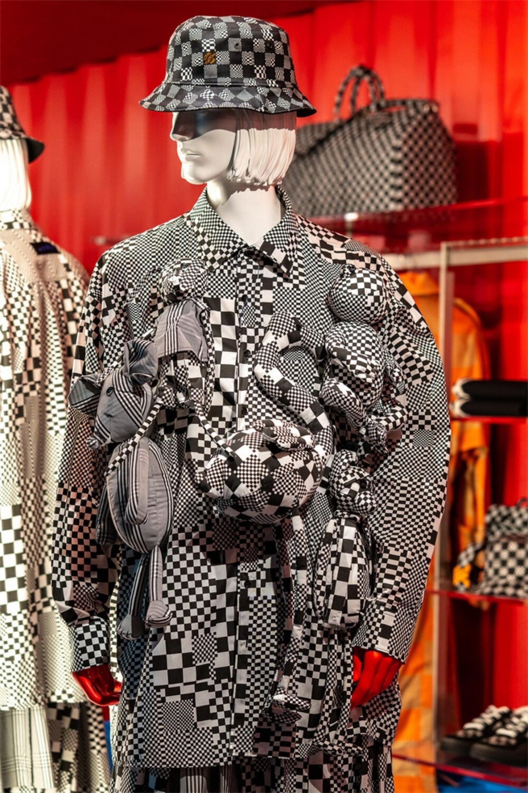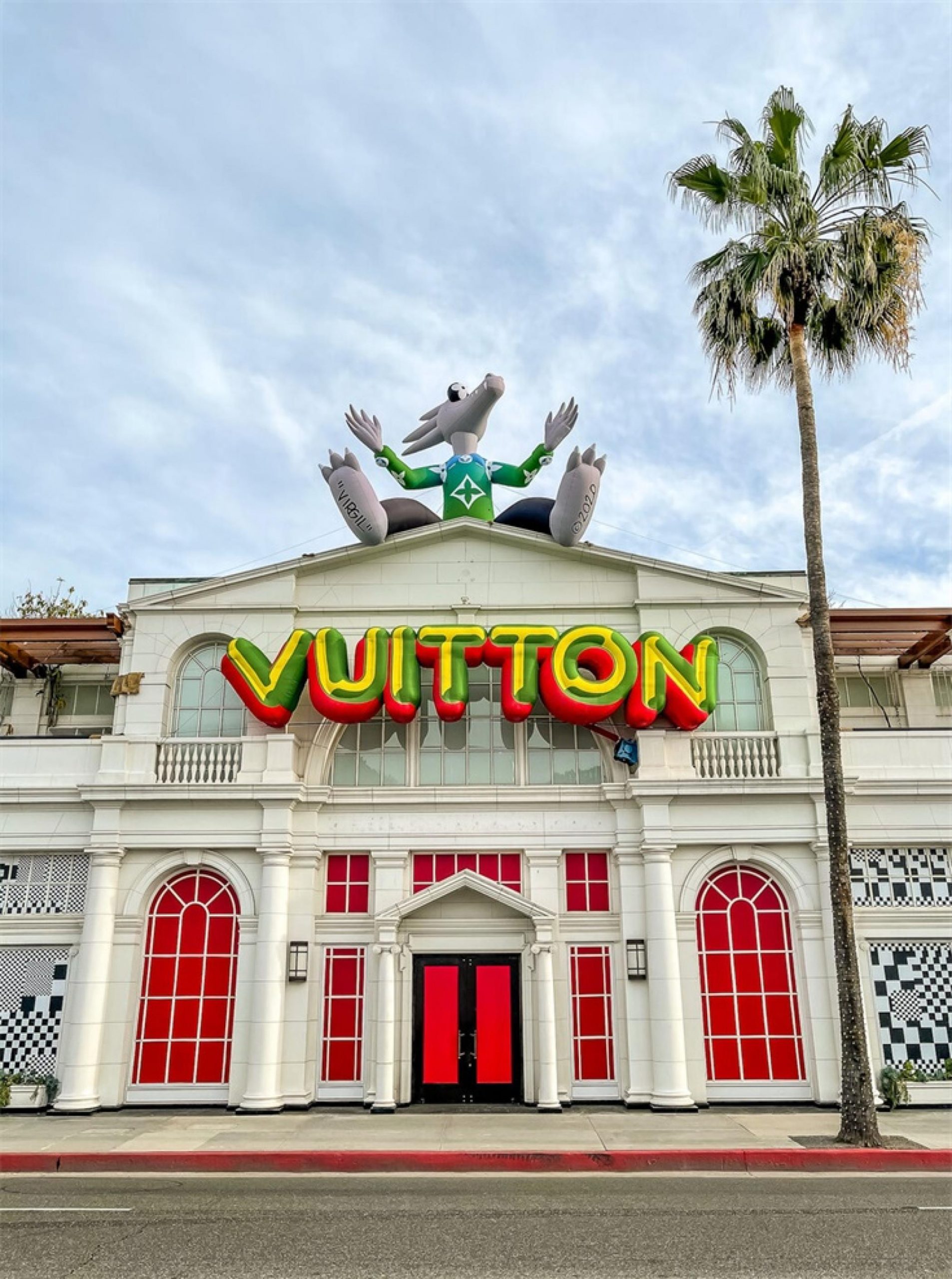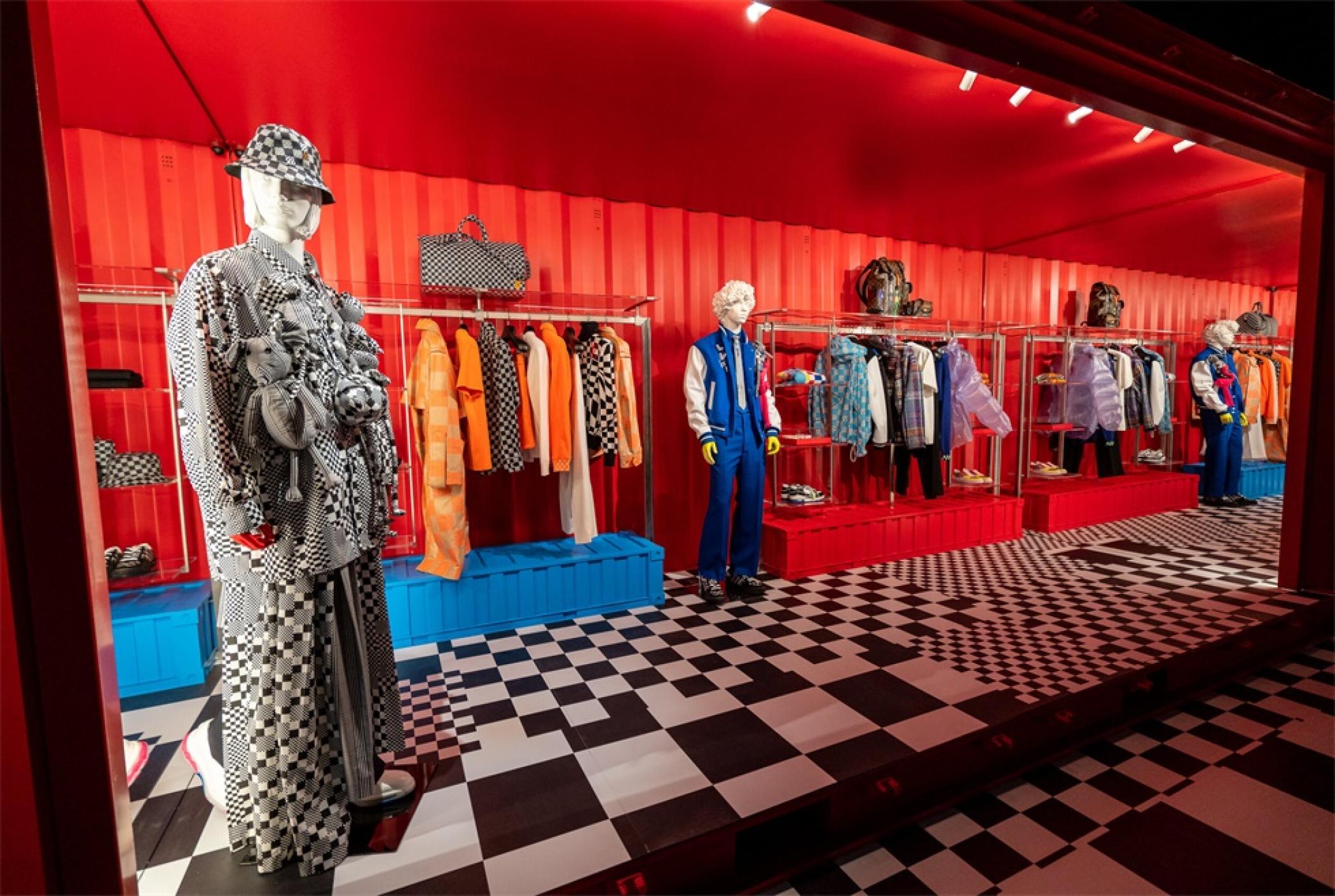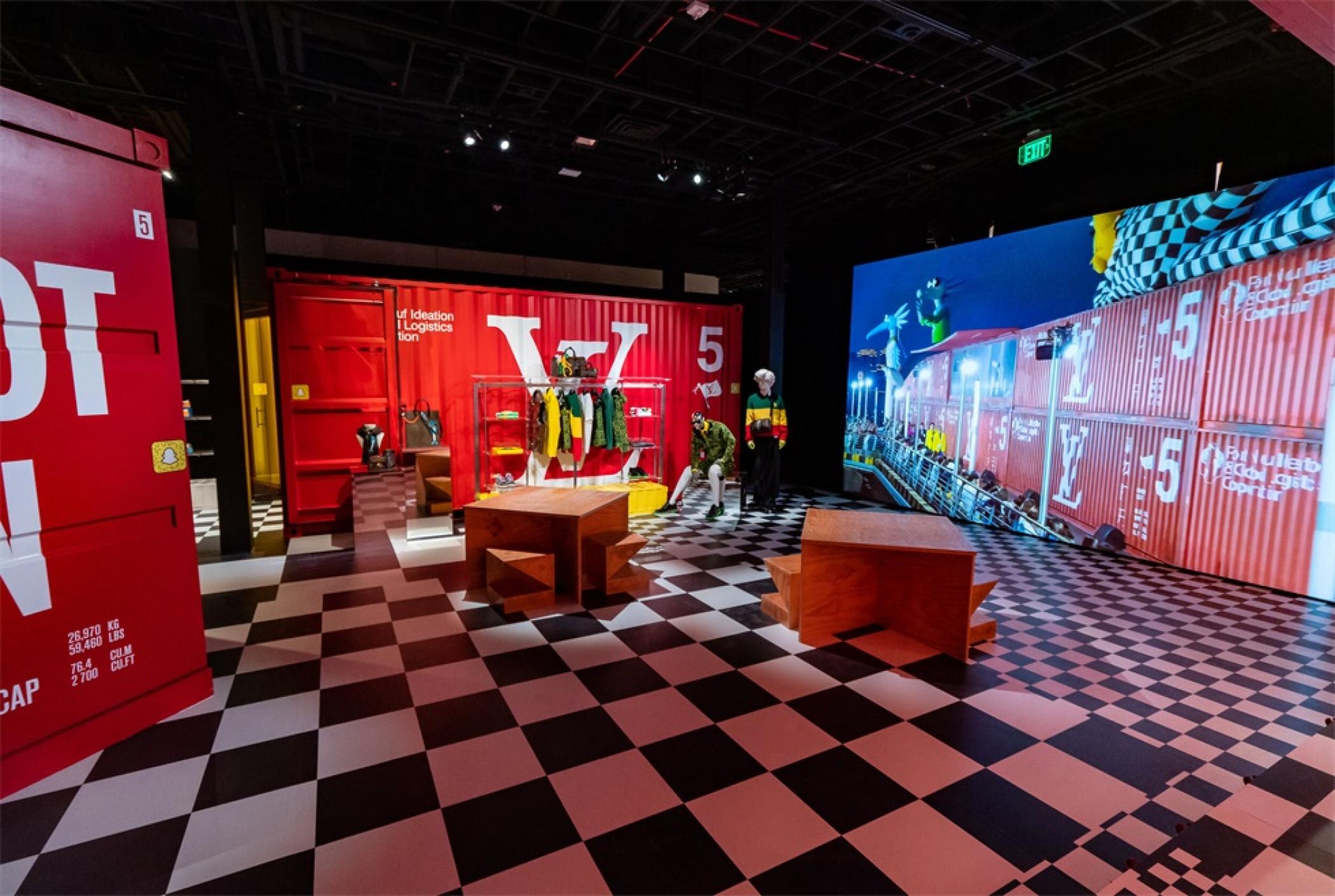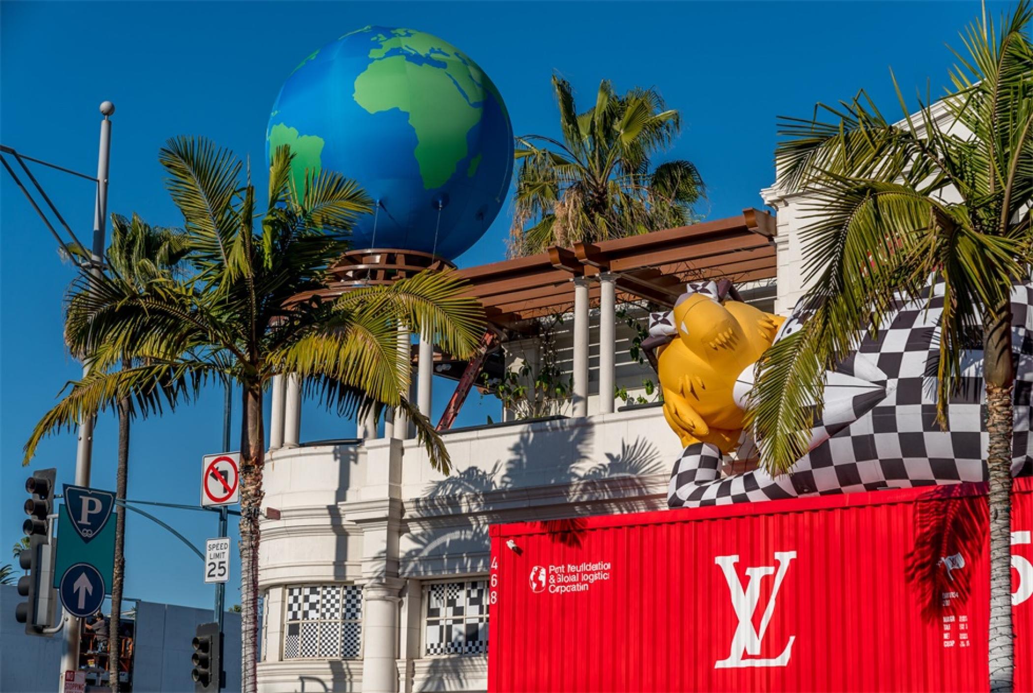 “路易.威登X”臨時的藝術展示活動項目是在羅迪歐大道北端打造的一個必看的體驗,吸引了大量人群和國際媒體。“路易.威登男人的臨時居所”的活動時間更短,活動目的是展示路易威登2021年春夏男裝系列,而裝置的亮點是一個鮮紅色的集裝箱“入口”。集裝箱主題延續(xù)在一層,作為1600平方英尺零售空間的背景,外部細節(jié)包括窗戶玻璃貼和巨大的充氣地球和卡通,這是整個項目的主題。