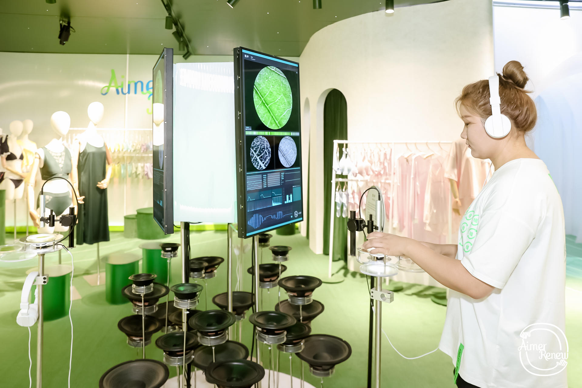 AIMER RENEW愛慕環(huán)保0碳計劃快閃店以多維的新奇互動體驗、多元的可持續(xù)時尚產(chǎn)品,向更多消費者傳達(dá)綠色低碳生活方式,為促進(jìn)碳中和、豐富生物多樣性貢獻(xiàn)一份力量。此次活動特別邀請中央美術(shù)學(xué)院設(shè)計學(xué)院藝術(shù)與科技方向藝術(shù)家邱宇、王和,將環(huán)保理念融入科技藝術(shù)互動裝置作品《微·聲》、《Symbiosis 共生》,升級線下互動體驗,傳達(dá)綠色低碳生活方式,引導(dǎo)人們深度思考與自然生態(tài)的關(guān)系,關(guān)注碳中和、關(guān)注人類共同的未來。