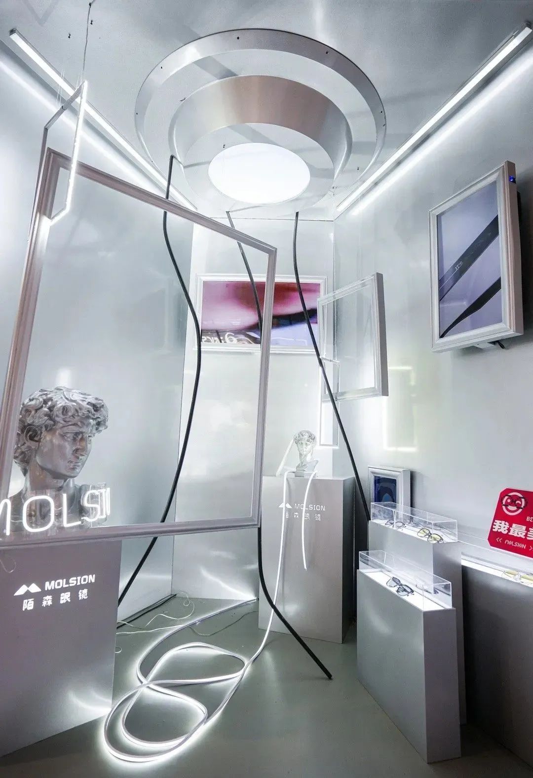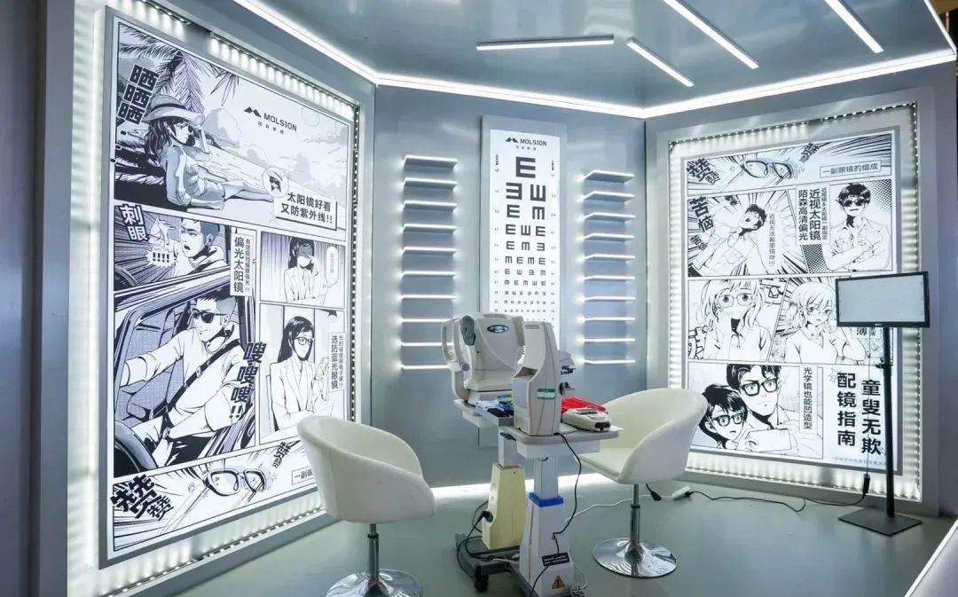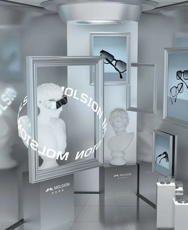 同樣是眼鏡品牌類目的快閃項(xiàng)目,陌森的這場(chǎng)設(shè)計(jì)相對(duì)簡(jiǎn)單,設(shè)計(jì)圖和現(xiàn)場(chǎng)效果圖對(duì)比,每一個(gè)場(chǎng)景都是為了拍照打卡而生。飯圈的粉絲流量讓這個(gè)項(xiàng)目收獲了很多線上傳播的熱度。