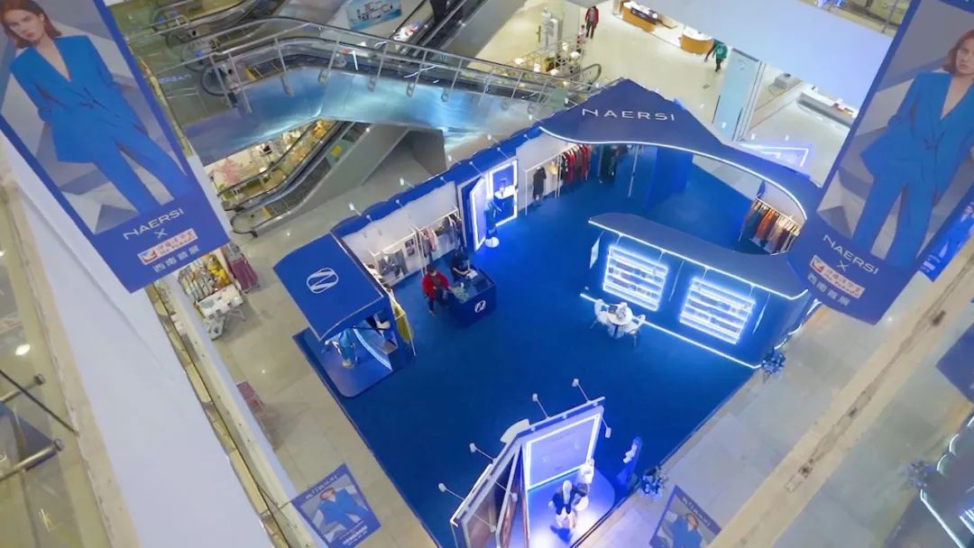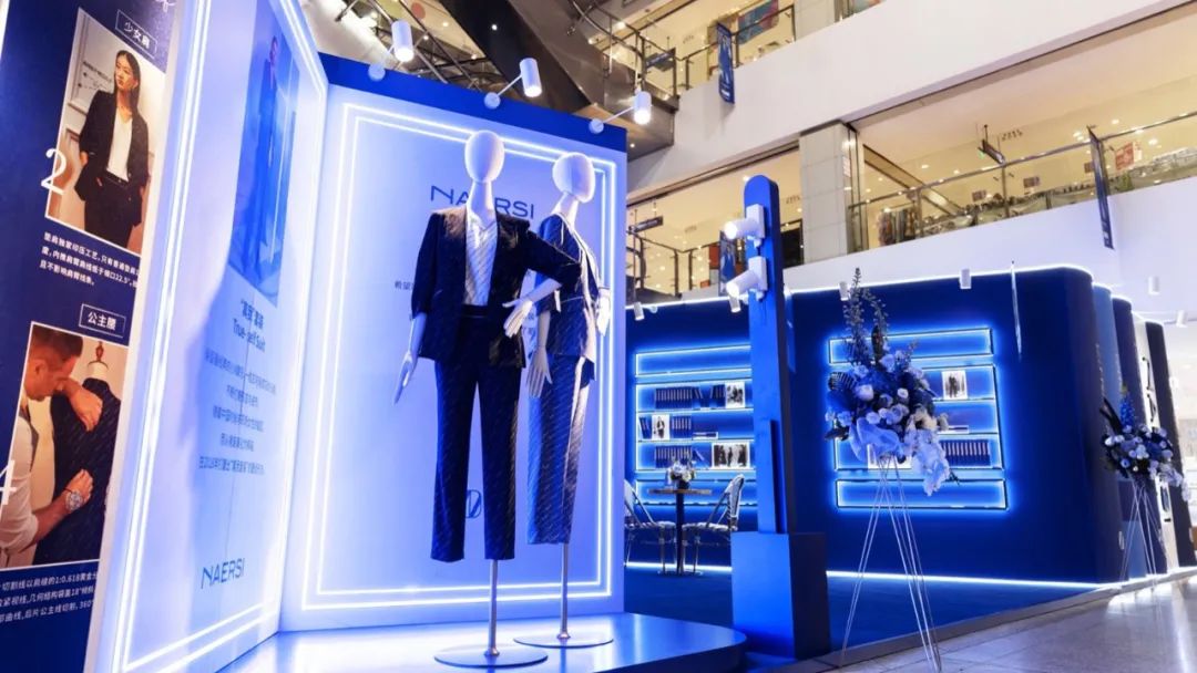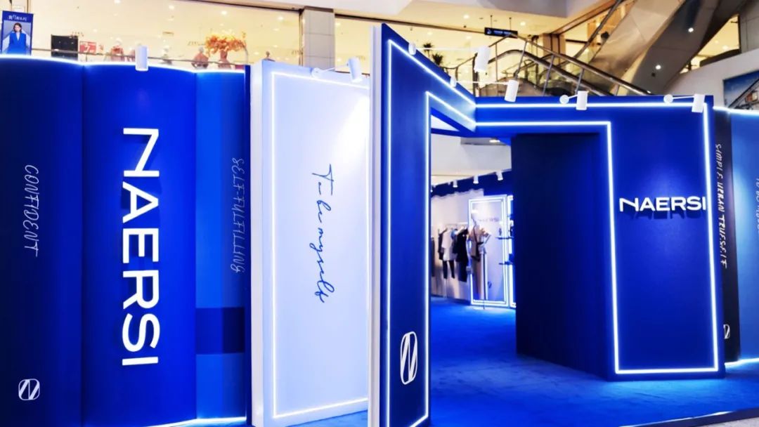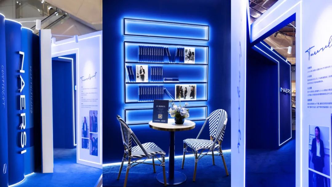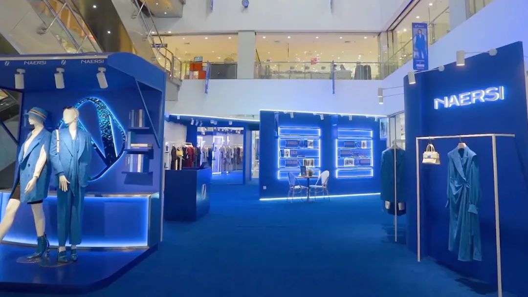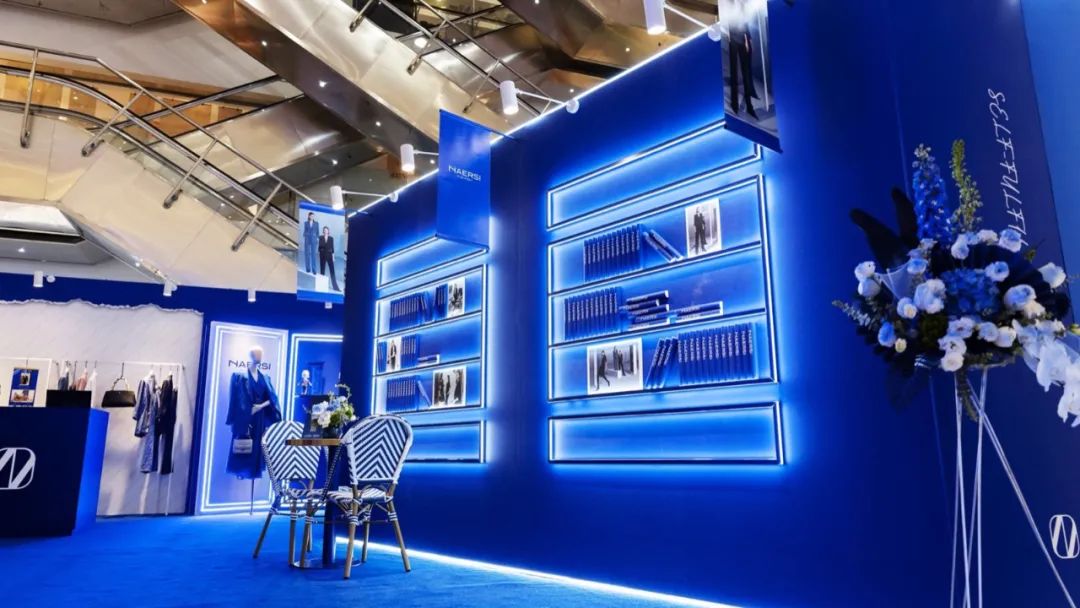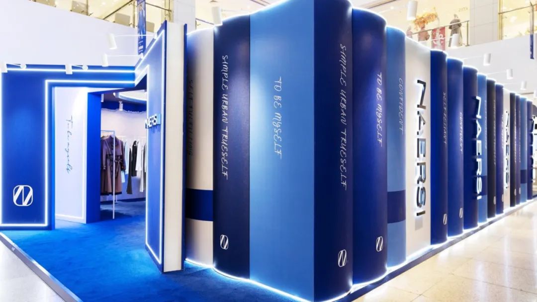 25°真我時(shí)光快閃店的設(shè)計(jì)靈感源自“書寫真我”,以書為媒記錄NAERSI真我套裝,入口是一個(gè)書本啟幕章頁(yè),搭配大面積靜謐藍(lán)調(diào)空間,彰顯都市職業(yè)女性的自信美。展館內(nèi)春夏新品區(qū)成衣十分搶眼采用NAERSI獨(dú)特標(biāo)識(shí)的25%uB0藍(lán)這片區(qū)域依靠“大書皮”而立仿佛在細(xì)數(shù)成衣設(shè)計(jì)的演變歷程。整個(gè)快閃店有不少書籍元素背靠書柜,以書為媒仿佛與NAERSI“真我套裝”的打磨時(shí)光進(jìn)行了一場(chǎng)空間的對(duì)話。