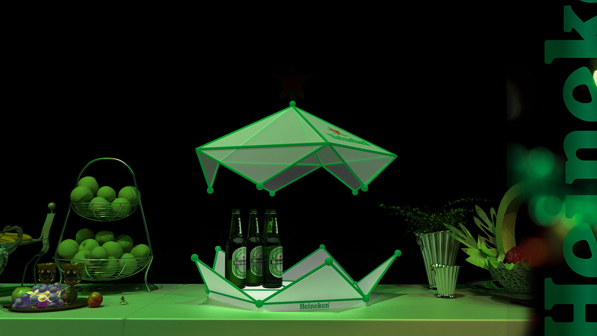 而喜力啤酒那一抹青綠色的主色調(diào),給人一種清爽自然的感覺(jué),有一種夏天蓬勃發(fā)展的動(dòng)力,象征的是一種向上的生命力,再加上那一個(gè)點(diǎn)綴性的紅色五星,青春、活力。而這個(gè)喜力啤酒的道具模型展覽展示的設(shè)計(jì)上,主色調(diào)的綠依舊是大面積的使用,再配上多邊形球體的裝置,放佛有種宇宙星球的即視感,更讓人想一探究竟的沖動(dòng)和興奮,一起和尚逸文化小編看看這組展覽展示的設(shè)計(jì)效果圖吧。
