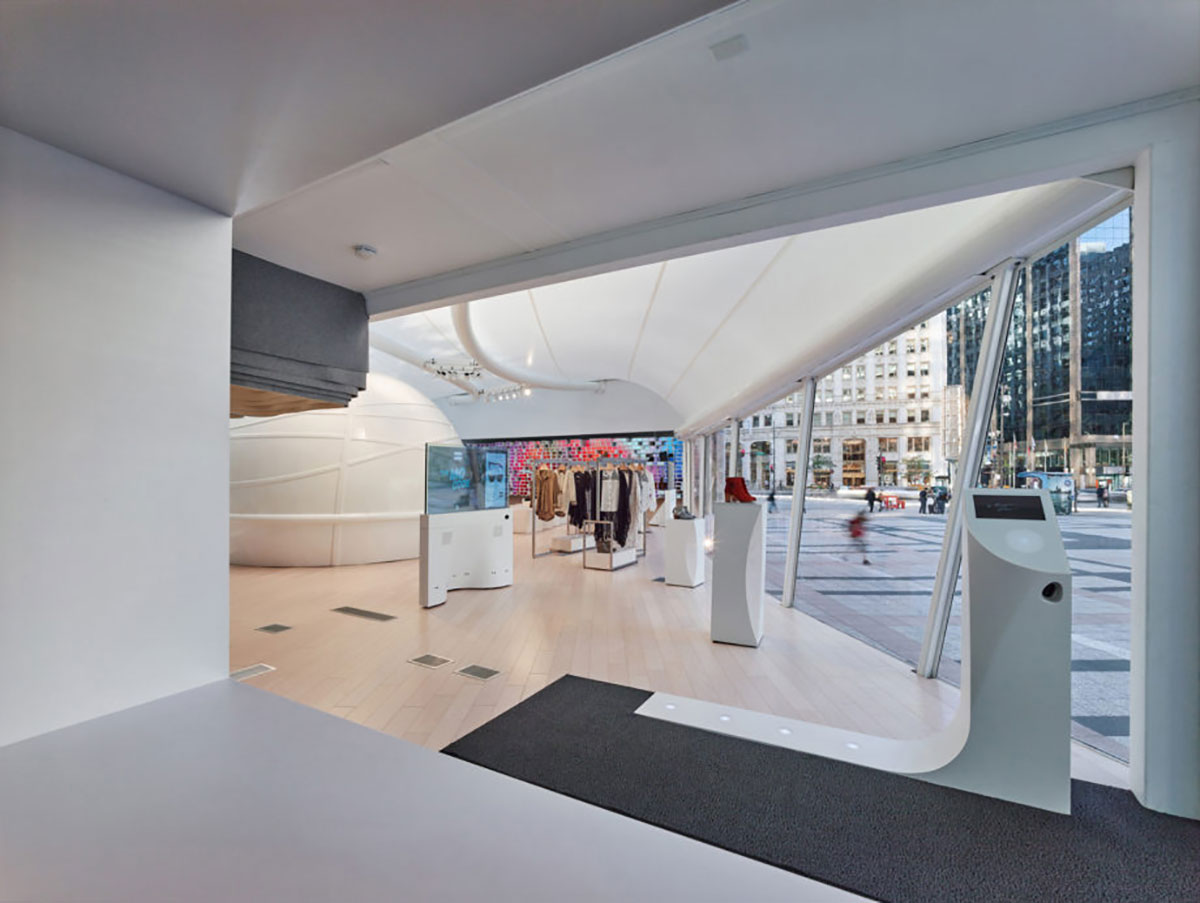 芝加哥的WithMe Mobile快閃店共279平方米,該快閃店引入了一個(gè)新的零售模型,其像素墻為900個(gè)7英寸屏幕,形成一個(gè)小型電動(dòng)伸縮架。每個(gè)電動(dòng)可伸縮擱架可以與墻壁齊平放置或延伸,以提供放置產(chǎn)品的位置。所有產(chǎn)品都預(yù)先嵌入RFID標(biāo)簽中。當(dāng)消費(fèi)者拿產(chǎn)品查看時(shí),讀取器因無(wú)法讀取產(chǎn)品標(biāo)簽來(lái)過(guò)濾數(shù)據(jù)以獲得產(chǎn)品的相關(guān)數(shù)據(jù),當(dāng)消費(fèi)者選擇靠近像素墻的產(chǎn)品時(shí),產(chǎn)品信息會(huì)自動(dòng)顯示在數(shù)字屏幕上。