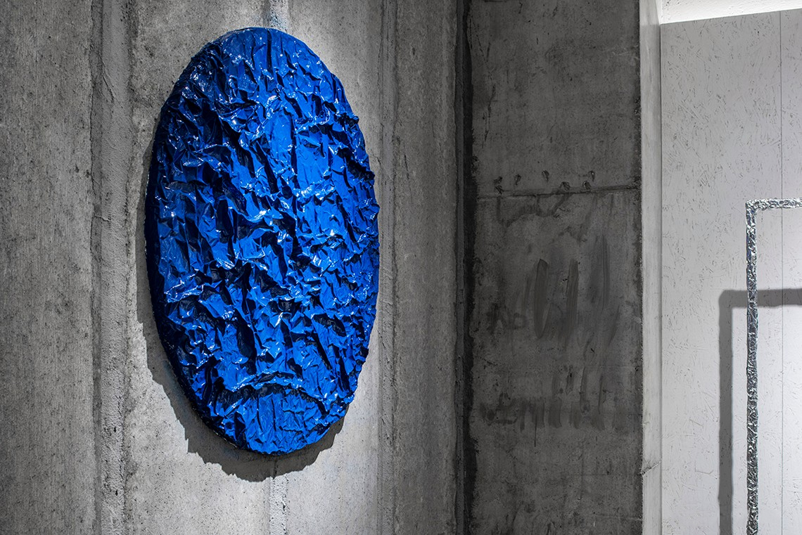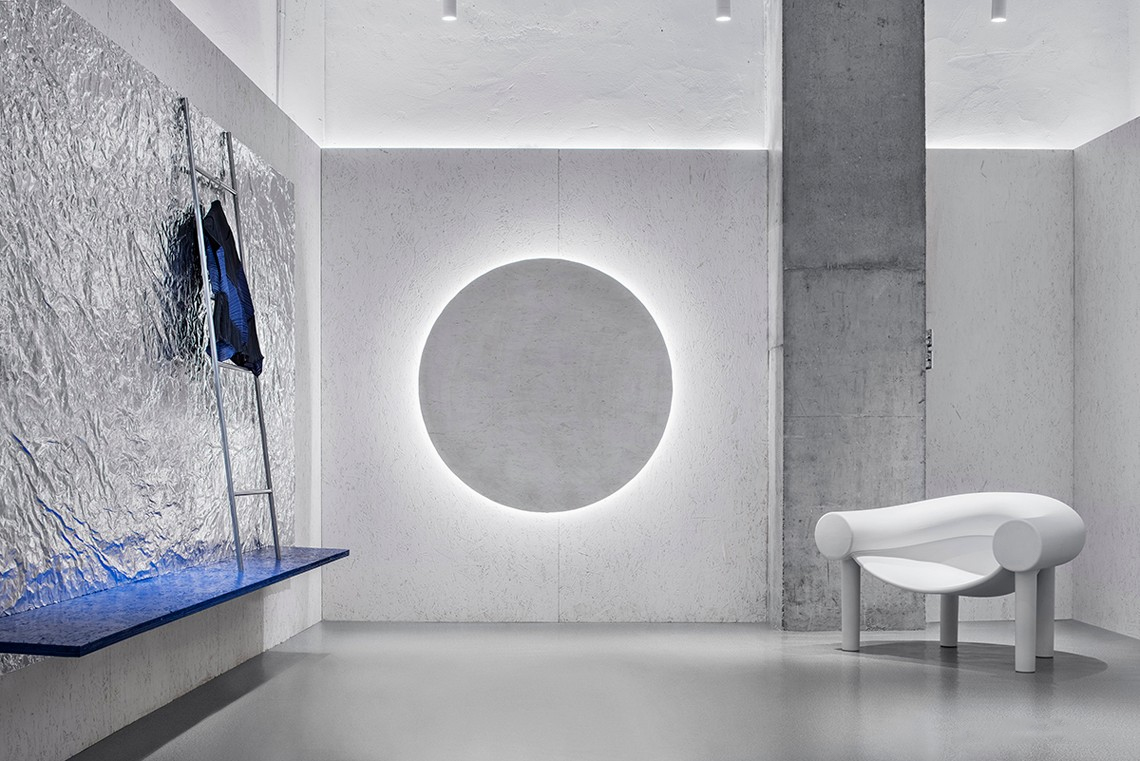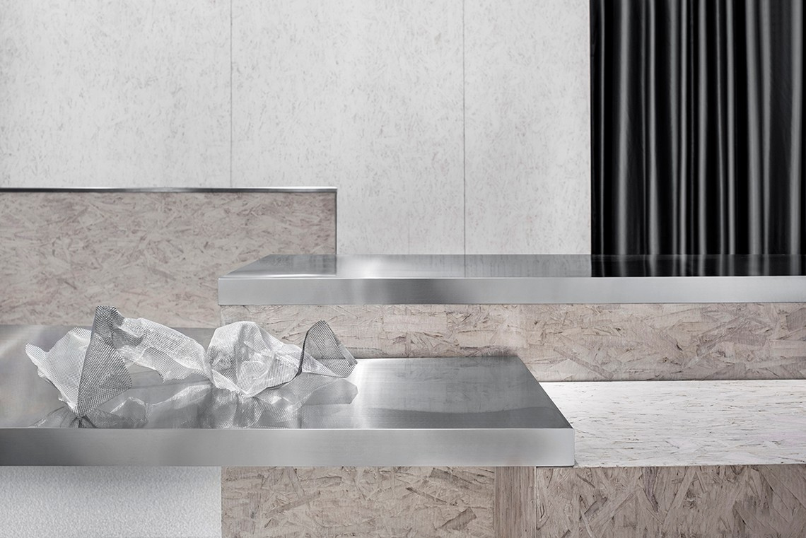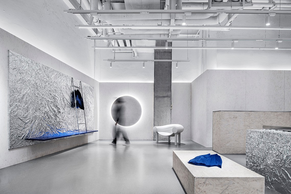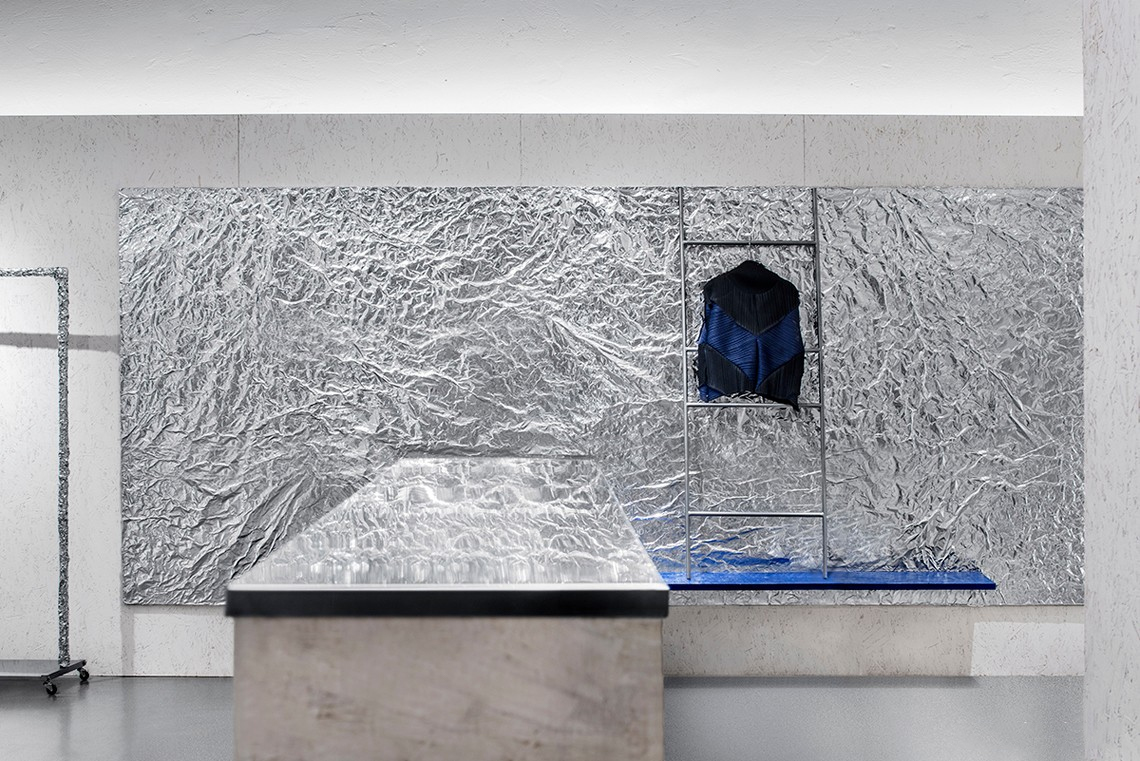 錫紙被揉皺后又鋪展開,人為制造出隨機(jī)的肌理和材質(zhì)本身的金屬質(zhì)感回應(yīng)了服裝面料的工藝和光澤感,又與啞光的乳白色刨花板產(chǎn)生對比。這些材料加強(qiáng)了人們對于品牌核心面料的感受,成為品牌印象的一部分。