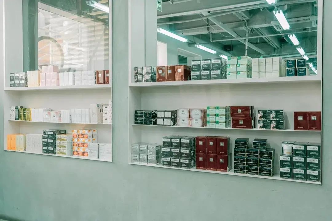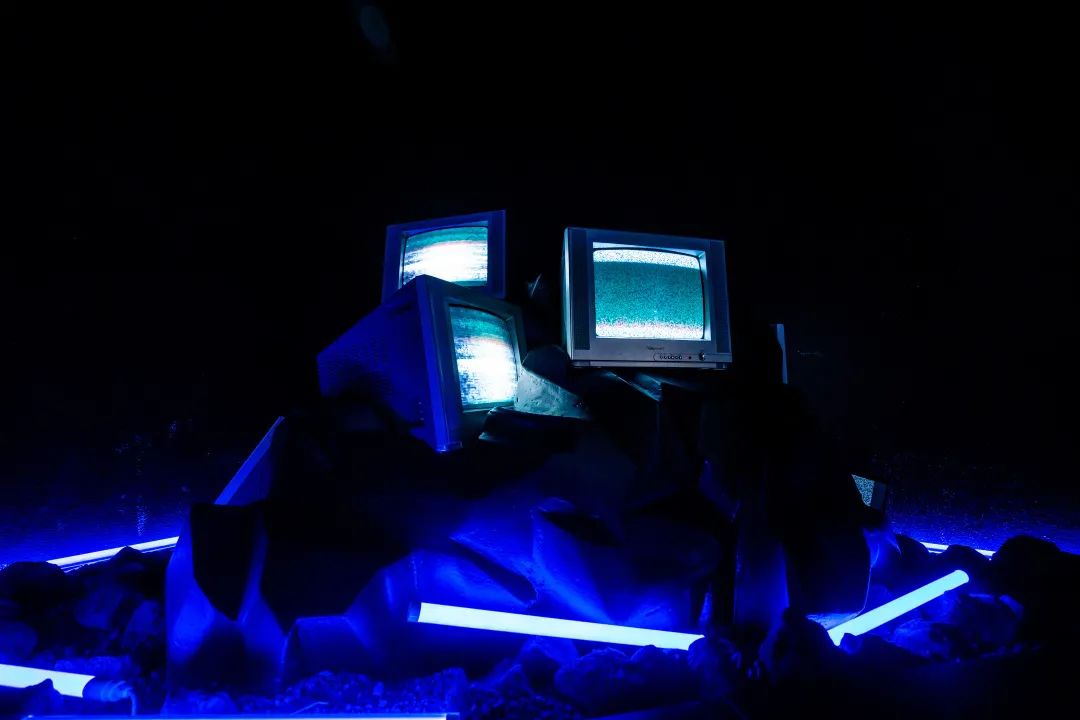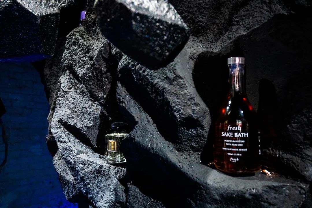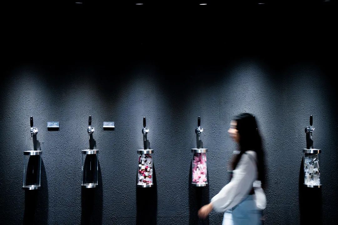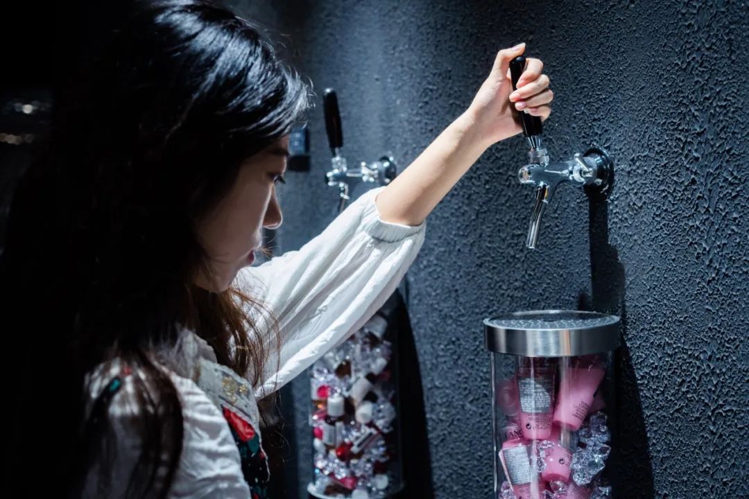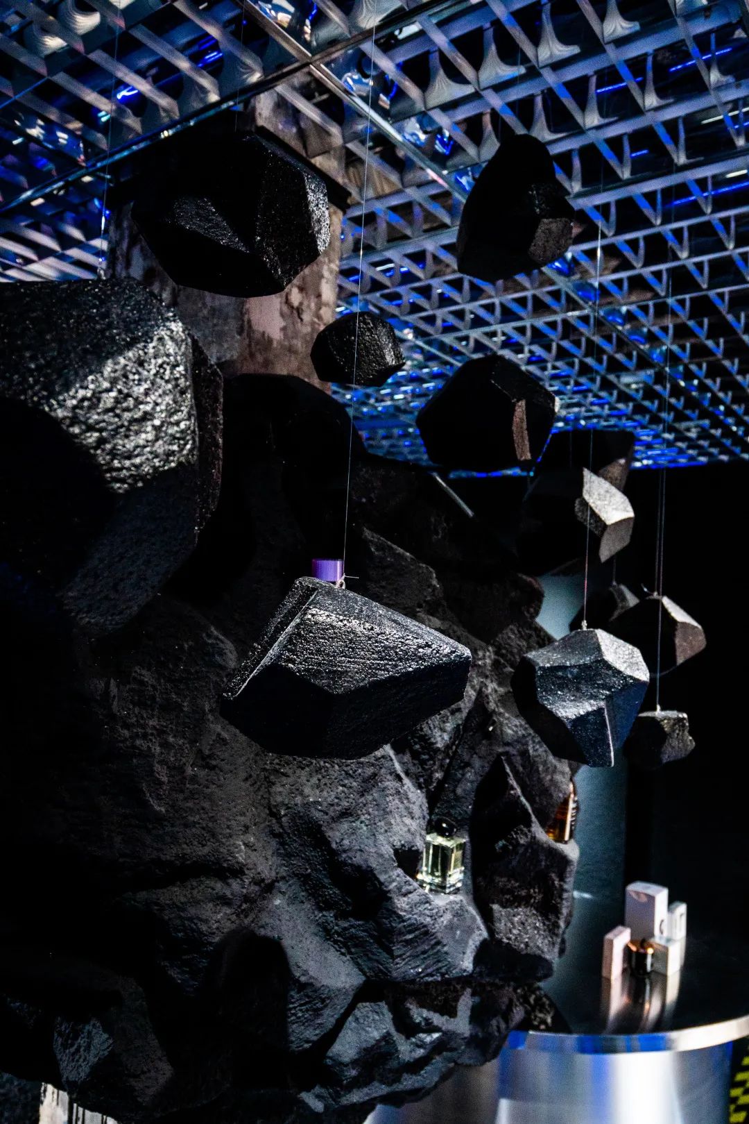 還沒進店就被一股神秘力量吸引,進去之后感覺來到了另一個空間,碳石水晶閃爍著宇宙的神秘光芒,丟失信號的電視機滋滋作響,“賽博朋克”風被詮釋的淋漓盡致。巨大的隕石群漂浮在空中,無數(shù)大小的隕石迸射出虛幻的光芒,暗黑工業(yè)風似乎充滿著神秘力量,伸手仿佛就能觸摸到。裝著各式大牌美妝的鐵皮桶,散落在隕石山上,這里可是拍出時尚大片的絕佳打卡點,隨手一拍就是大片既視感 。