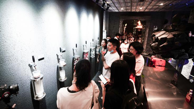 不經(jīng)意間總有種在宇宙空間站行走的錯覺,墻壁里裝滿蘭蔻、SK-II、紀梵希等護膚品小樣,正是話梅的品牌理念與整個空間的結(jié)合,滿滿的時尚感與空間感。最吸睛的還是角落里的老式電視機,閃爍的雪花屏配合變幻的燈光,電視負責賽博,酒吧負責朋克,賽博朋克的感覺立馬就出來了。