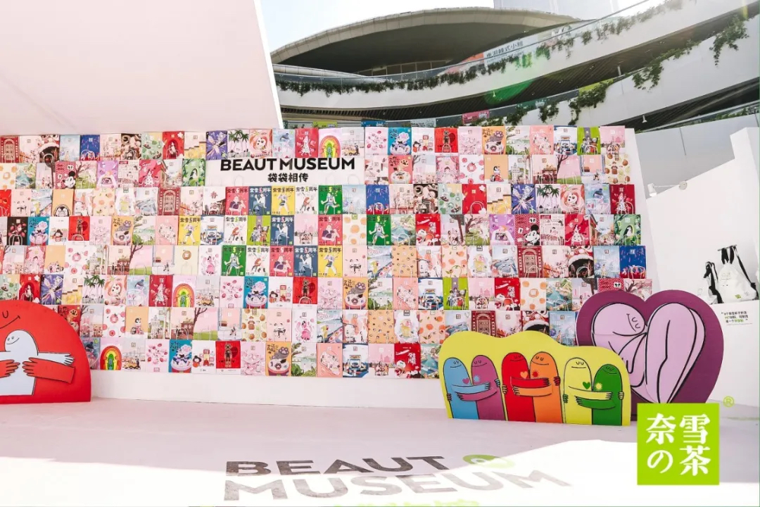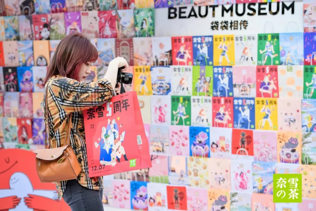 快閃造勢(shì)、粉絲狂歡的同時(shí),奈雪也借著生日這一契機(jī),開設(shè)“美好研究所”“美好茶研室”“美好未來”“美好博物館”“美好萬物”5大主題展區(qū),向消費(fèi)者展示自己過去一年在產(chǎn)品、設(shè)計(jì)、環(huán)保等多方面的重要成績。粉絲可以在美好研究所中和霸氣草莓、霸氣橙子這些可愛的IP形象打卡合影;也可以在美好茶研室中,感受奈雪這5年經(jīng)歷的茶日常與茶文化。而有著“獨(dú)家記憶藝術(shù)空間”之稱的奈雪美好博物館,一次性展示了100余款獨(dú)具特色的奈雪手提袋,充分滿足了粉絲們的觀賞欲和收集癖。
