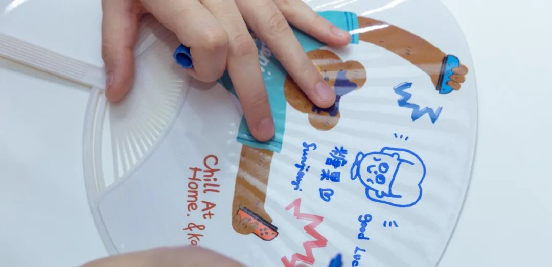 快閃店復(fù)刻了孫佳藝插畫場(chǎng)景,以明亮的粉色與黃色作為主色調(diào),抓人眼球的繽紛顏色令人紛紛駐足?,F(xiàn)場(chǎng)共設(shè)四個(gè)不同的互動(dòng)體驗(yàn)區(qū)域,以巧思妙想的設(shè)計(jì)邀請(qǐng)大家來(lái)體驗(yàn)孫佳藝輕松愉悅的生活方式。步入產(chǎn)品展示的“小熊衣柜”區(qū)域,消費(fèi)者掃碼即可獲得主題插畫團(tuán)扇,公眾號(hào)回復(fù)關(guān)鍵詞“小熊夏日計(jì)劃”更可獲得冰淇淋一份,為炎熱的夏日帶來(lái)一絲清爽。在店鋪周圍,更設(shè)置了用于拍照打卡的“泳池派對(duì)”區(qū)域、“健身房”區(qū)域和“小熊畫室”區(qū)域,映入眼簾的滿是治愈又充滿想象的趣味插畫。插畫藝術(shù)家孫佳藝也于周末親臨小熊畫室,在分享自己的創(chuàng)作靈感之余,與粉絲親密互動(dòng),一起腦洞大開(kāi),為粉絲在團(tuán)扇上創(chuàng)作有趣的插畫,將快閃店內(nèi)氣氛推至高潮。